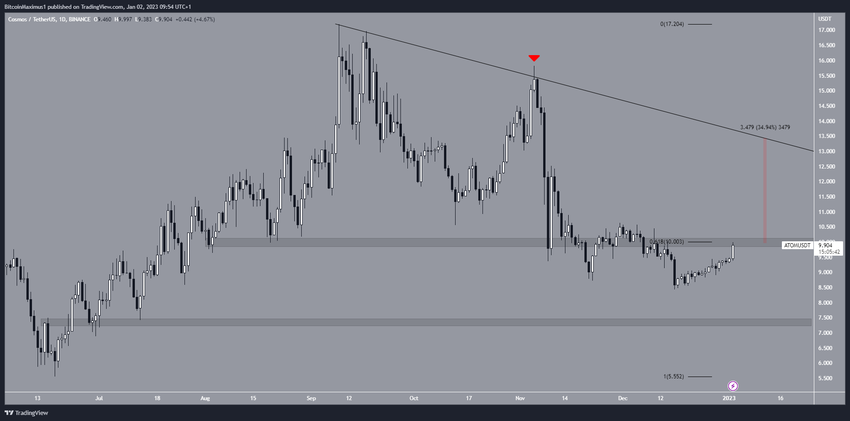 Xem xét kỹ hơn phân tích kỹ thuật từ khung thời gian hàng ngày sẽ đưa ra dự đoán giá ATOM tháng 1/2023 là tăng. Có hai lý do chính cho điều này: