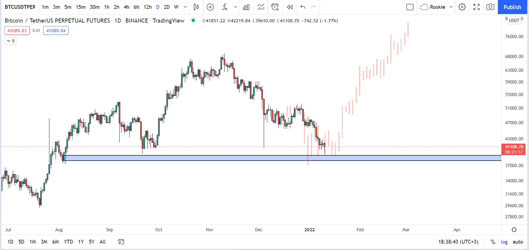 Từ ngày 16/12/2021, tức cách đây gần một tháng khi Bitcoin vẫn còn được giao dịch trên 40,000 USD, @altcoinrookie đã đưa ra một dự báo đường giá như sau: