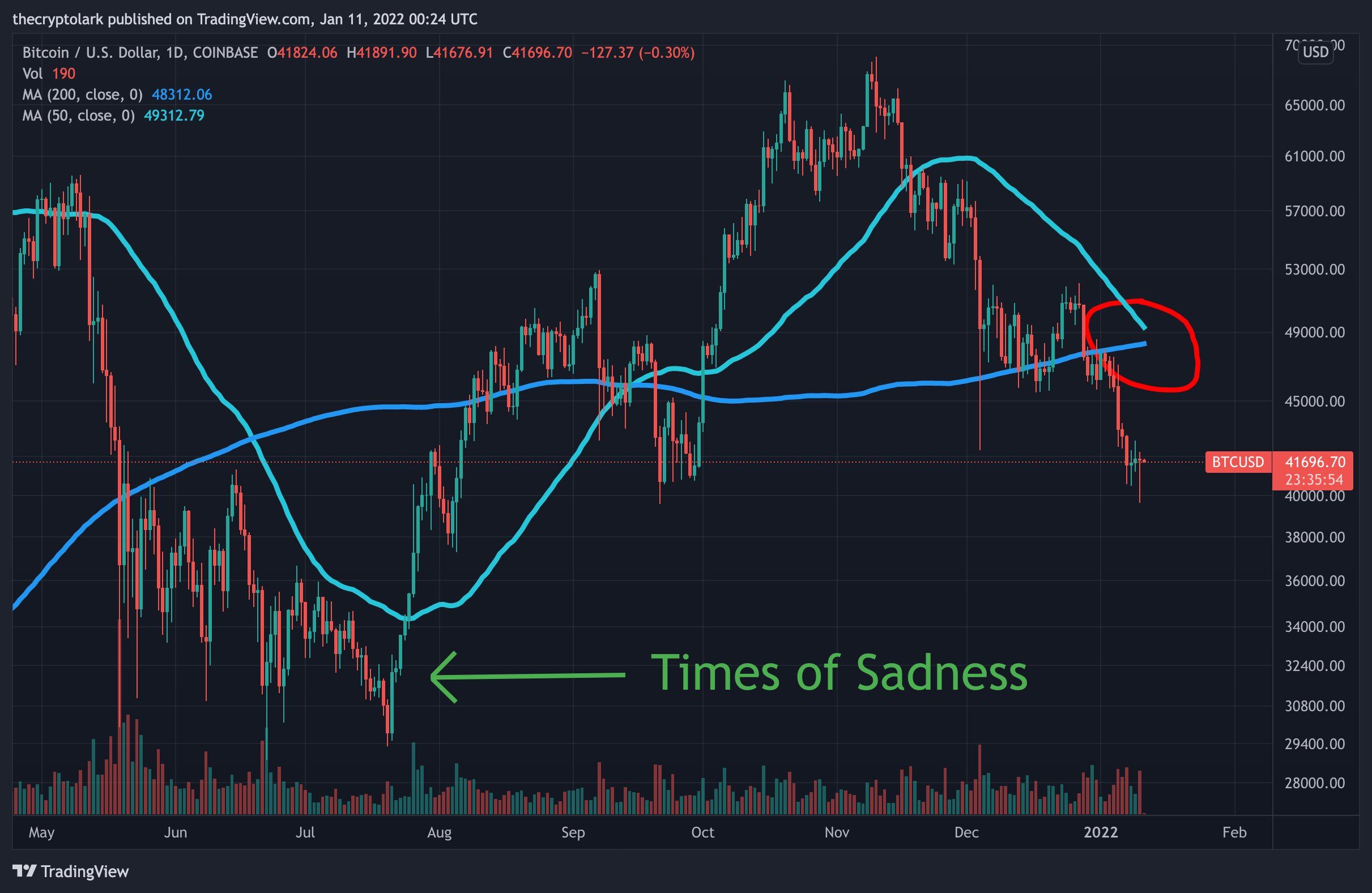 - Bitcoin đang bắt đầu tiến gần đến một “giao cắt tử thần”. (“giao cắt tử thần” là giao cắt giữa MA50 và MA200, khi đó MA50 cắt xuống MA200, ngược lại được gọi là “giao cắt vàng”).
