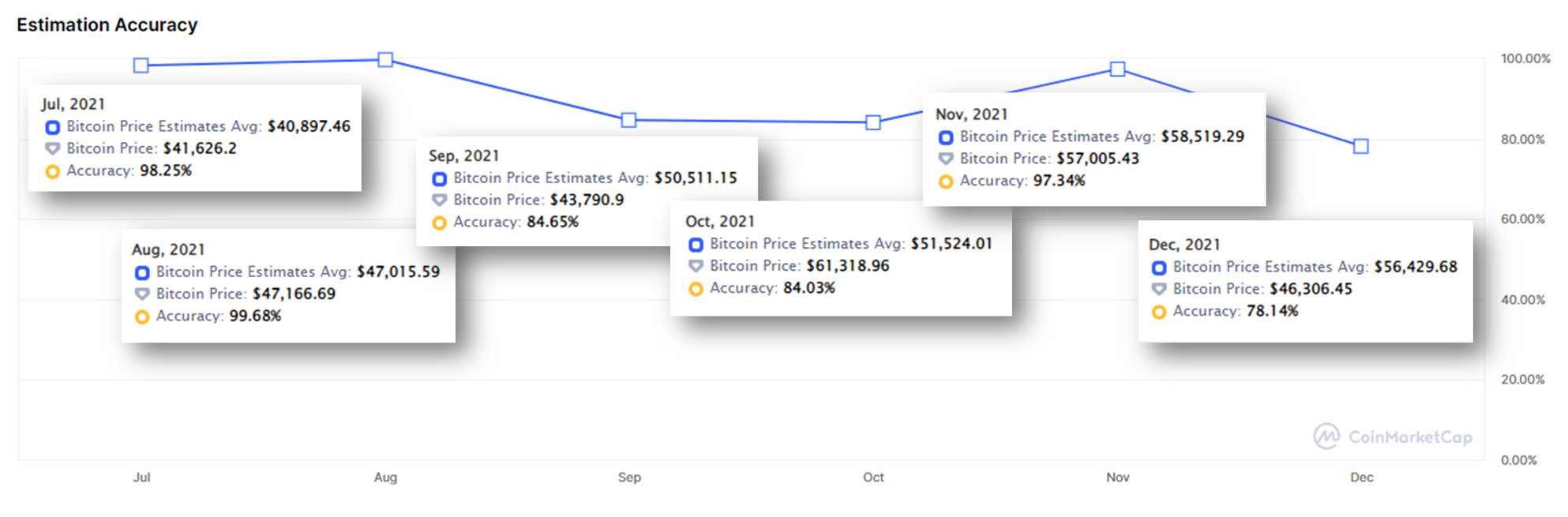- Có thể thấy, tháng 7 cộng đồng này đã dự đoán chính xác 98.25% tại giá trung bình là 40,897 USD (thực tế 41,626 USD). Tháng 8 dự đoán chính xác 99.68% tại mức giá trung bình 47.015 USD (thực tế 47,166 USD). Tháng 9 dự đoán chính xác 84.65% tại mức giá trung bình 50,511 USD (thực tế 43,790 USD). Tháng 10 dự đoán chính xác 84% tại mức giá trung bình 51,524 USD (thực tế 61,318 USD). Tháng 11 dự đoán chính xác 97% tại mức giá trung bình 58,519 USD (thực tế 61,318 USD). Tuy nhiên tháng 12 cho tỷ lệ thấp nhất với độ chính xác chỉ 78% với mức giá trung bình 56,429 USD (thực tế 46,306 USD).