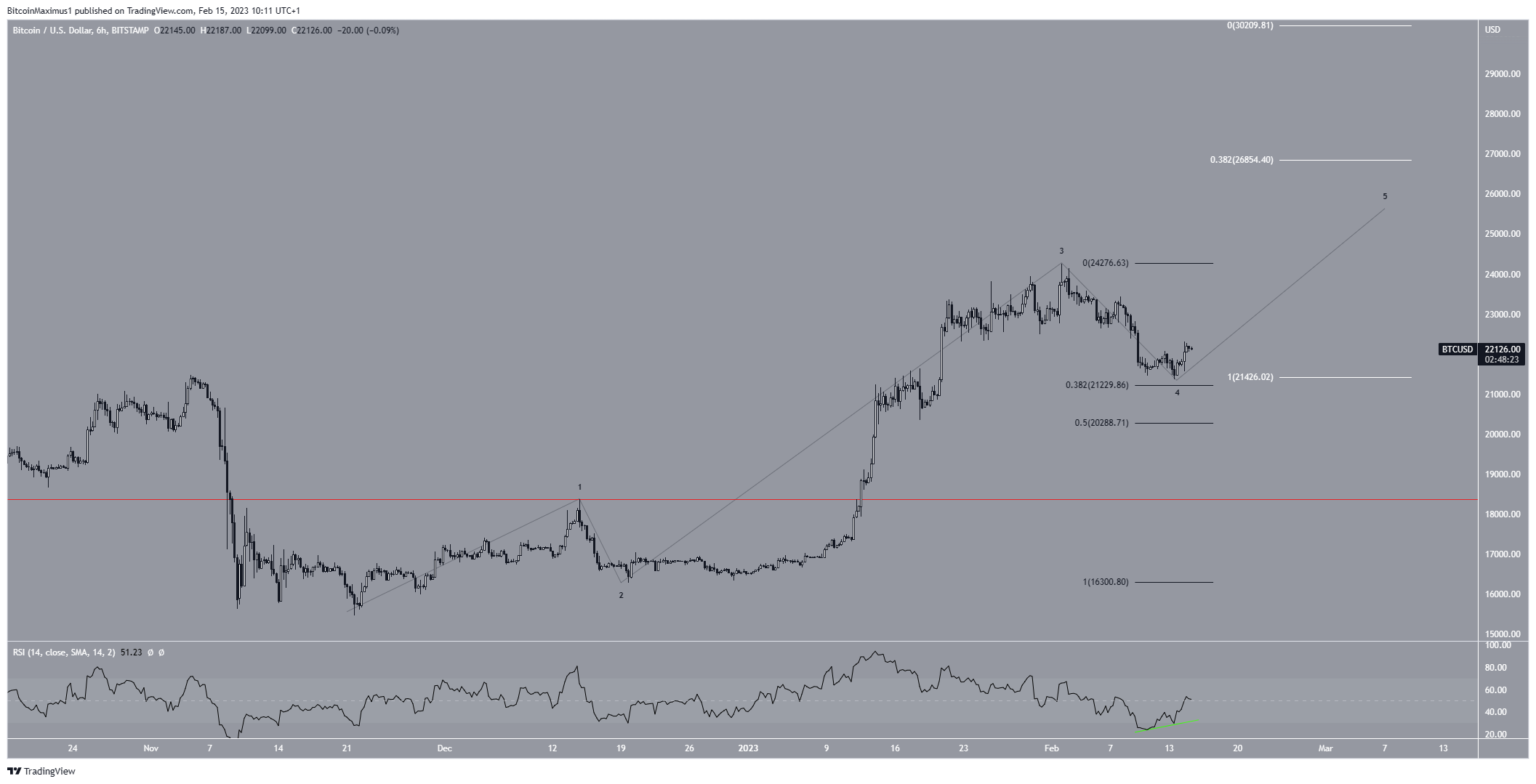 Cuối cùng, biểu đồ 6 giờ hỗ trợ khả năng tăng giá. Lý do cho điều này là sự phân kỳ tăng hình thành trong chỉ báo RSI (đường màu xanh lá cây) và số lượng sóng. Số lượng sóng cho thấy BTC đang ở sóng bốn trong một chuyển động đi lên gồm năm sóng. Hai đỉnh cao nhất của sóng năm là 26,845 USD và 30,200 USD. Chúng được tính ra bằng cách sử dụng phần mở rộng trên sóng một và sóng ba (màu trắng).