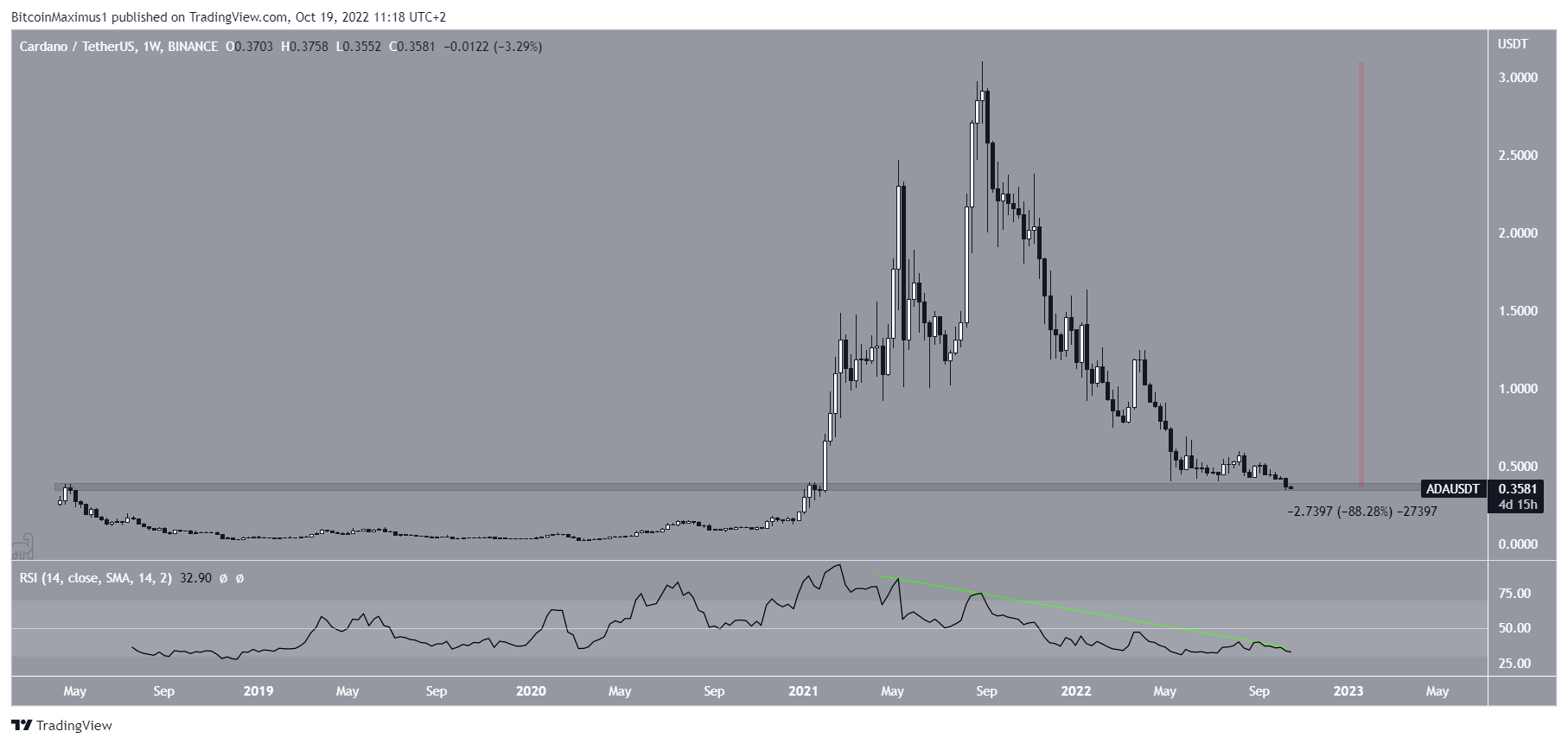 Giá ADA đã đi xuống kể từ khi đạt mức cao nhất mọi thời đại là 3.10 USD vào tháng 8/2021. Sự biến động đi xuống đã dẫn đến mức thấp nhất là 0.35 USD vào ngày 13/10. Đo lường từ mức ATH, giá ADA đã giảm 88%.