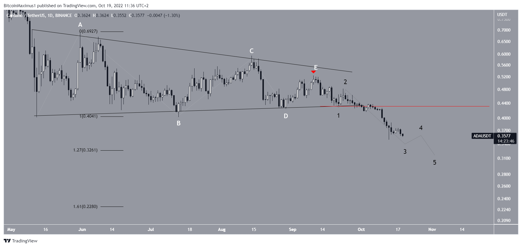 Phân tích kỹ thuật đếm sóng cho thấy giá ADA đã giảm với tốc độ nhanh kể từ khi hoàn thành việc đếm hình tam giác đối xứng vào ngày 10/9 (biểu tượng màu đỏ). Kể từ đó, số lượng sóng phụ được đưa ra bằng màu đen. Nó cho thấy rằng giá Cardano nằm trong sóng phụ 3 hoặc 5.