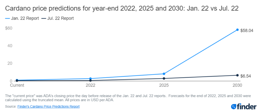 Các dự đoán trung và dài hạn khá là thú vị. Phần lớn nhóm chuyên gia cho rằng ADA có thể đạt mức 2.93 USD vào cuối năm 2025. Cá biệt có một dự đoán ADA sẽ đạt 6.54 USD vào cuối năm 2030. Nhìn chung những dự đoán này vẫn thấp hơn dự báo do Finder đưa ra vào tháng 1 năm 2022.