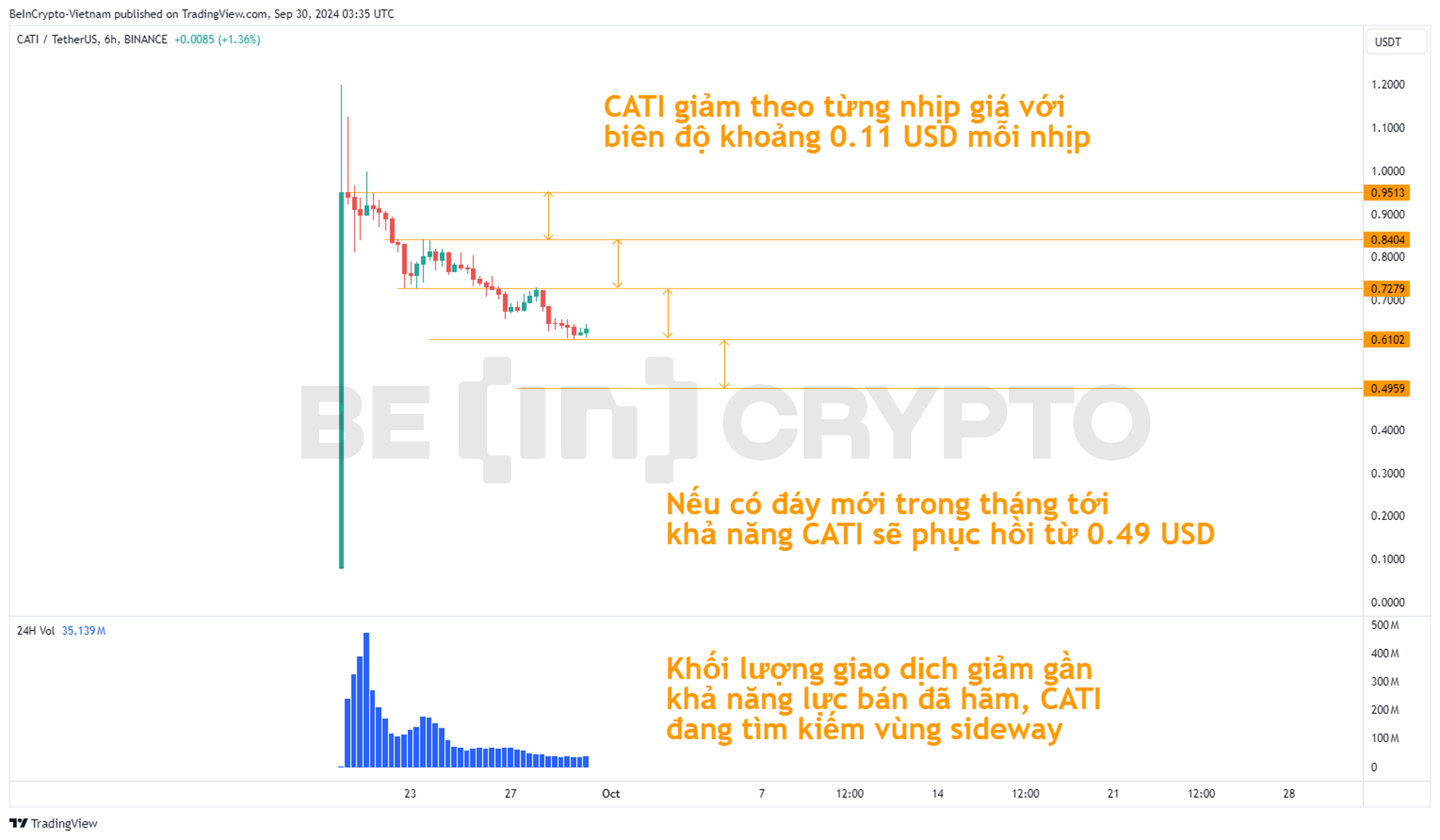 Dữ liệu giá CATI vẫn chưa đủ nhiều để áp dụng các chỉ báo kỹ thuật trung bình, nhưng nếu quan sát biến động giá từ khi niêm yết Binance đến nay, có thể nhận thấy một vài đặc điểm như sau: