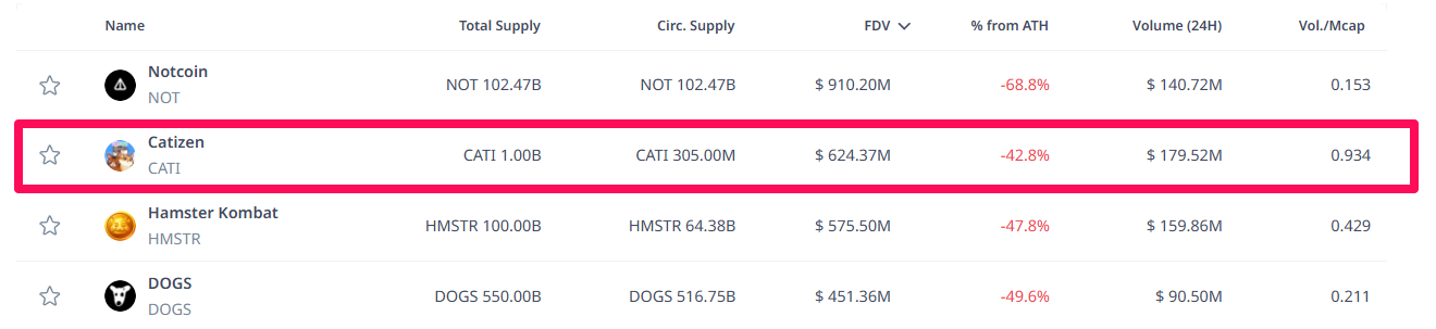 - CATI có khối lượng giao dịch cao nhất trong danh sách các Telegram mini app được niêm yết, với gần 180 triệu USD/ngày. Theo đó, tỷ lệ Vol/M.Cap của CATI cũng ở mức cao nhất với gần 90%. Điều này cho thấy thanh khoản CATI đang tốt nhất và nhu cầu giao dịch CATI vượt trội hơn các token cùng loại khác.