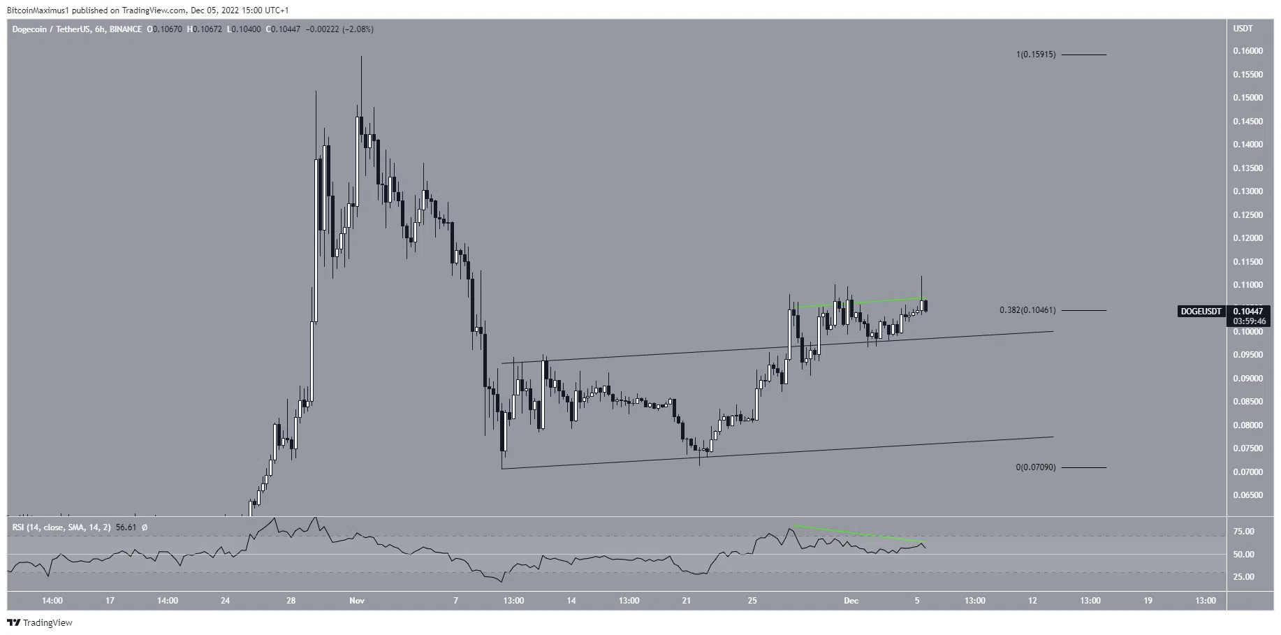 Giá Dogecoin (DOGE) đã tăng kể từ ngày 09/11. Nó đã tạo ra mức đáy cao hơn vào ngày 21/11 và tăng dần sau đó. Vào ngày 27/11, giá DOGE đã thoát ra khỏi một kênh song song tăng dần. Sau đó, DOGE đã tiếp tục tăng và đạt mức cao nhất là 0.111 USD vào ngày 05/12.