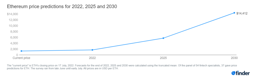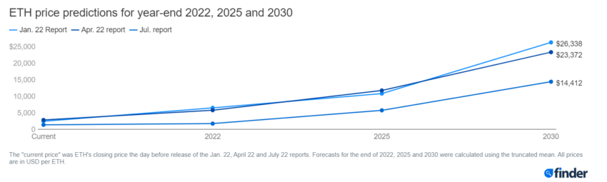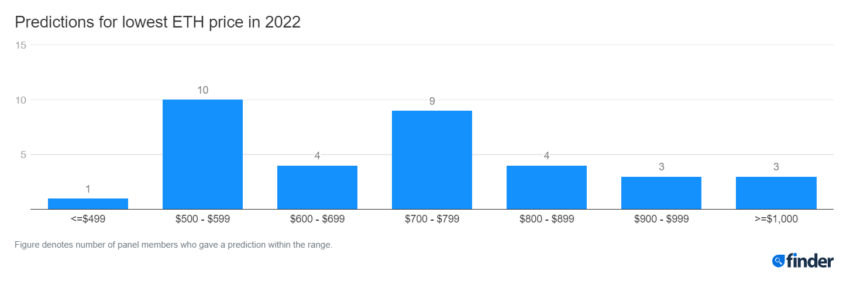 Những dự đoán này được đưa ra trong Báo cáo dự đoán giá Ethereum mới nhất của Finder.com. Nếu bạn nắm giữ Ethereum, Finder nói rằng bạn nên chuẩn bị cho một đợt biến động trong sáu tháng tới. Hội đồng tham gia báo cáo gồm các chuyên gia fintech và tiền điện tử dự đoán rằng ETH sẽ đạt 2,673 USD trong năm nay, trước khi giảm xuống còn 675 USD, và kết thúc năm 2022 ở mức 1,711 USD.