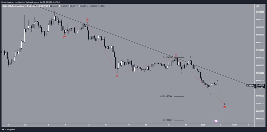 Nếu số lượng sóng là chính xác, giá Kusama sẽ giảm xuống còn 20.95 USD hoặc 17.8 USD. Các mục tiêu được tìm thấy bằng cách sử dụng các phép chiếu 1:0.618 và 1:1 của sóng một và sóng ba (màu đỏ). Cái sau cũng gần với vùng hỗ trợ Fib đã vạch ra trước đó, vì vậy mức giá trên có thể đạt được nếu chuyển động đi xuống cuối cùng kéo dài. Tuy nhiên, những gì diễn ra sau một chuyển động đi xuống gồm 5 sóng thường là một sự thoái lui mạnh. Nếu điều đó xảy ra, giá KSM cuối cùng sẽ thoát ra khỏi đường kháng cự giảm dần.