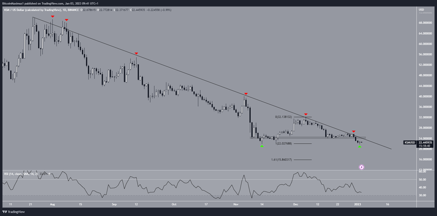 Giá Kusama (KSM) đã giảm xuống dưới đường kháng cự giảm dần kể từ tháng 7/2022. Đường này đã sáu lần từ chối KSM (biểu tượng màu đỏ) cho đến nay, lần gần đây nhất là vào ngày 30/12. Điều này dẫn đến mức giá tối thiểu là 20.62 USD vào ngày 02/1.