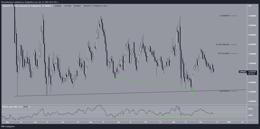 Nhìn vào biểu đồ khung thời gian hàng ngày cho thấy rằng chuyển động đi lên hiện tại được bắt đầu bằng một phân kỳ tăng (đường màu xanh lá cây) trong chỉ số RSI hàng ngày. Vào ngày 21/11 (biểu tượng màu xanh lá cây), giá Chainlink đã xác nhận sự phân kỳ tăng giá bằng cách bật lên và xác nhận đường hỗ trợ tăng dần dài hạn.
