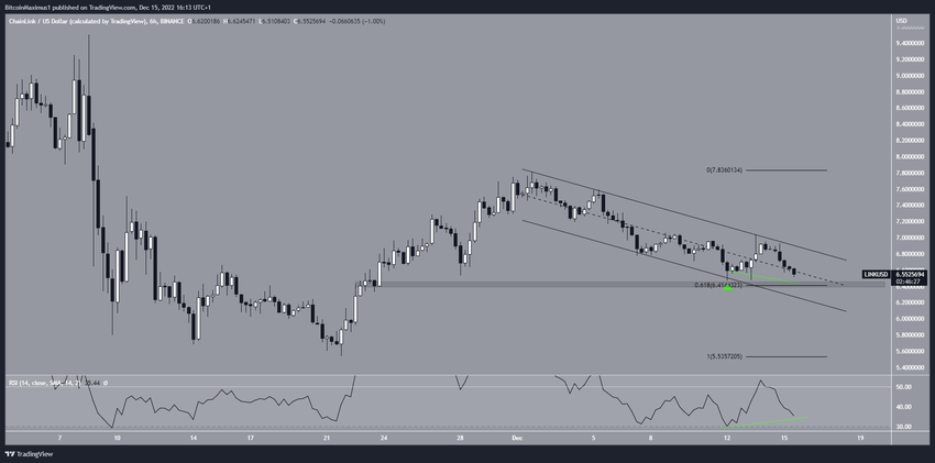 Ngoài ra, giá LINK đã bật lên ở vùng hỗ trợ 6.4 USD vào ngày 12/12 (biểu tượng màu xanh lá cây). Khu vực 6.4 USD là mức hỗ trợ thoái lui Fibo 0.618 và khu vực hỗ trợ nằm ngang. Vào thời điểm đó, mức này cũng trùng với đường hỗ trợ của kênh.