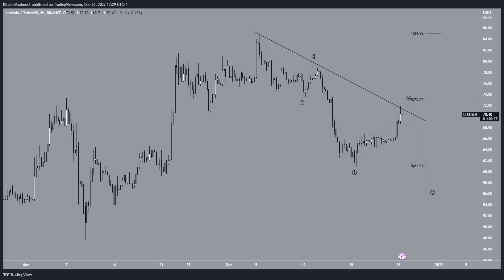 Hơn nữa, số lượng sóng có trọng tâm ở 73.49 USD. Một chuyển động bên trên nó sẽ làm mất hiệu lực của dự đoán rằng đây là chuyển động đi xuống gồm 5 sóng (màu đen). Và do đó xác nhận rằng đây chỉ là một sự điều chỉnh. Vì vậy, việc dự đoán giá Litecoin và xác định xu hướng trong tương lai sẽ phụ thuộc vào việc bứt phá hay bị từ chối. Trong trường hợp bứt phá thành công, giá Litecoin có thể tăng lên 100 USD. Còn nếu thất bại, giá sẽ giảm xuống còn 57 USD.
