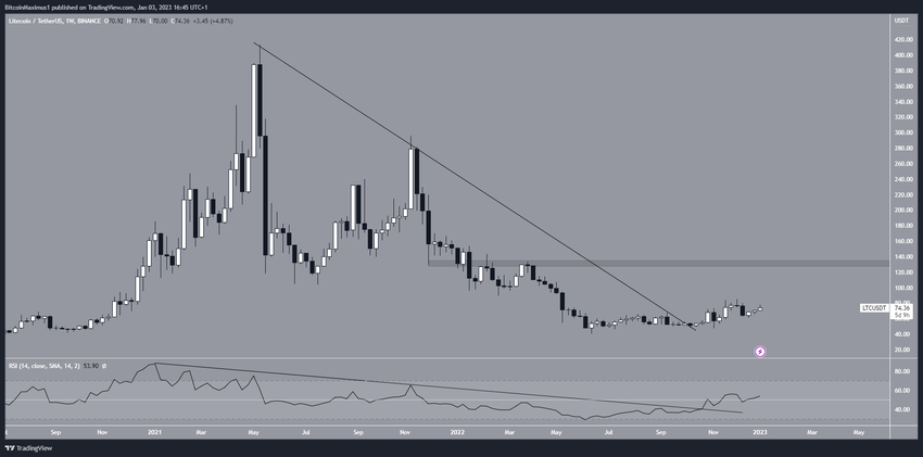 Chỉ số RSI hàng ngày hỗ trợ việc tiếp tục chuyển động đi lên. Chỉ báo đã di chuyển trên mức 50 và thoát ra khỏi đường xu hướng phân kỳ giảm giá (đường màu đen). Đây là một dấu hiệu thường đi trước các chuyển động đi lên. Do đó, dự đoán giá LTC tháng 1/2023 có khả năng nhất là tăng giá. Hơn thế nữa là sự tiếp tục của xu hướng tăng lên tới 130 USD. Ngược lại, giá đóng cửa nến ngày dưới 72.5 USD sẽ làm mất hiệu lực dự đoán giá tăng này.
