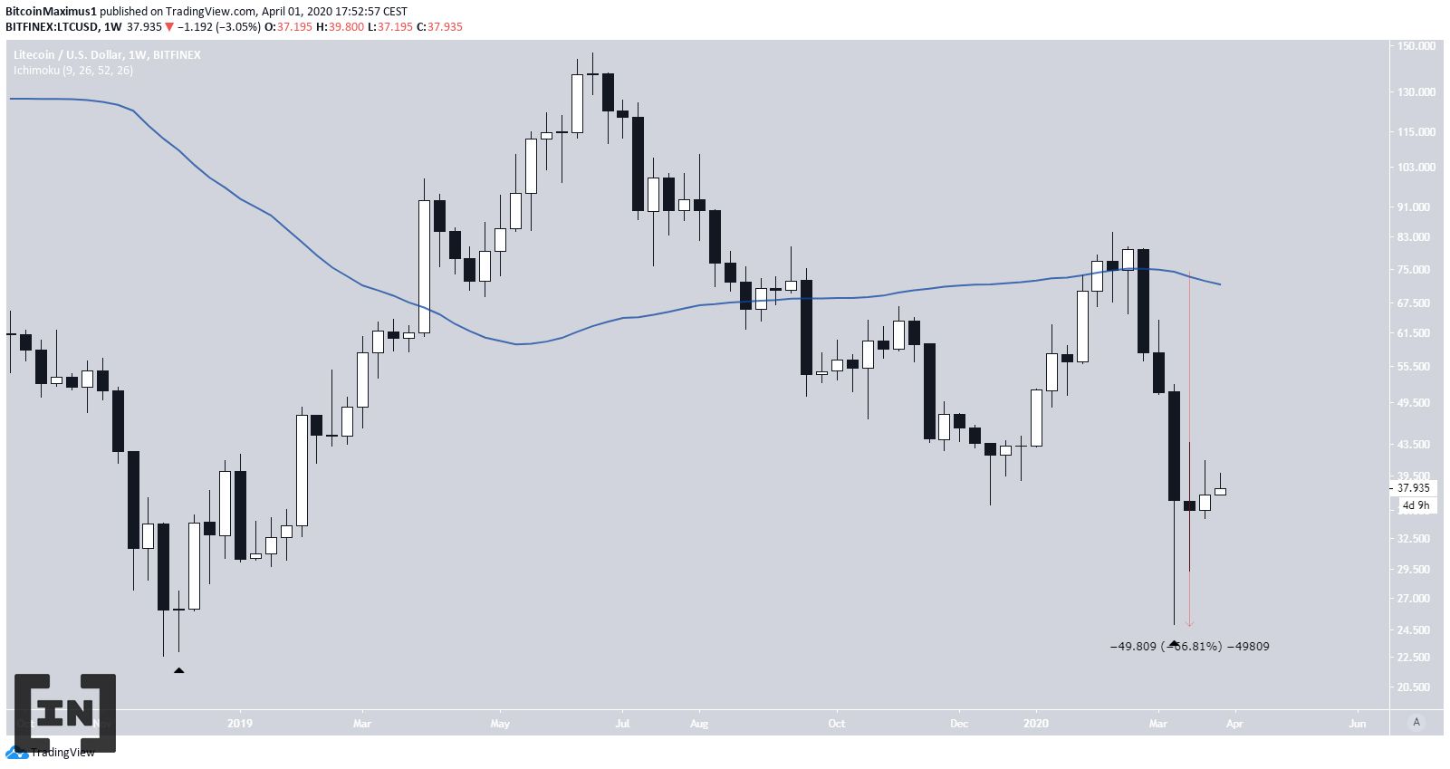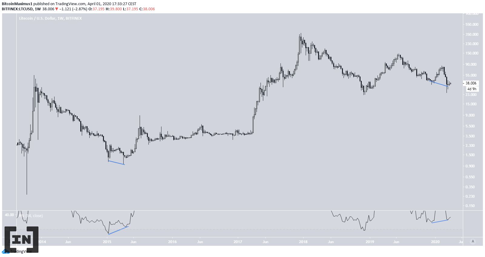 Sau khi bắt đầu một động thái tiến lên. Giá Litecoin đã giảm 100% khi nó tạo ra sự phân kỳ tăng ở mức thấp. Vào thời điểm đó, nó thấp đến đáng kể (> 60%), dưới mức di chuyển 50 tuần của Trung bình cộng.