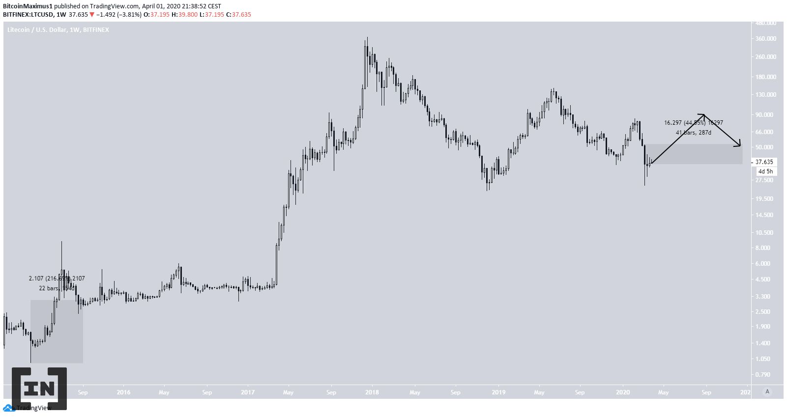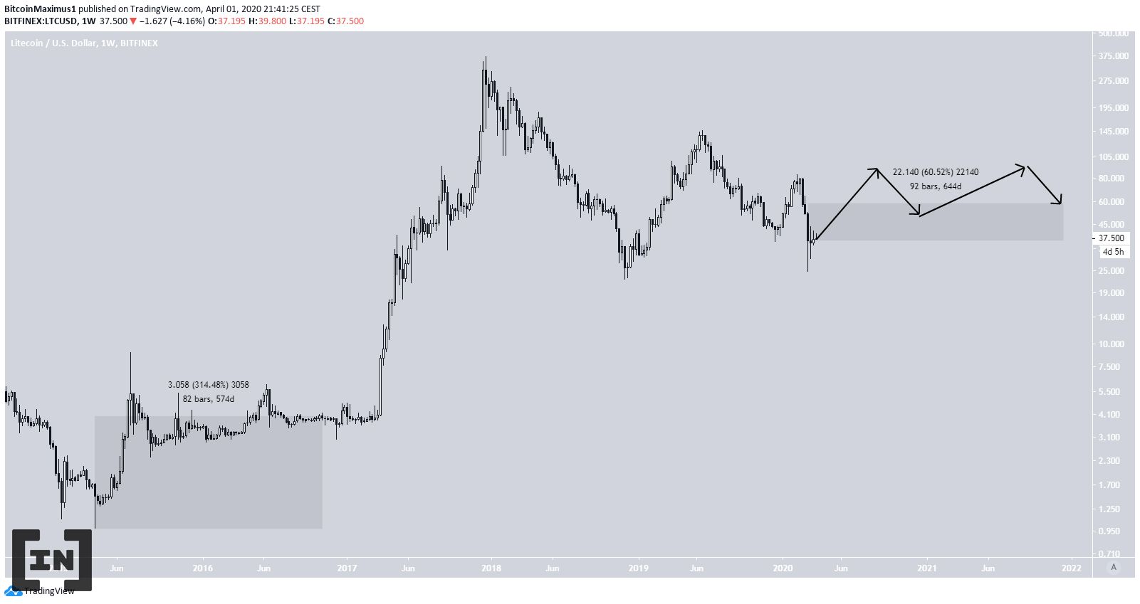Các dự đoán sau đây được đưa ra với giả định rằng giá Litecoin sẽ đi theo mô hình mà chúng tôi đã đưa ra do có nhiều điểm tương đồng giữa biến động giá vào tháng 1/2015 và tháng 3/2020.