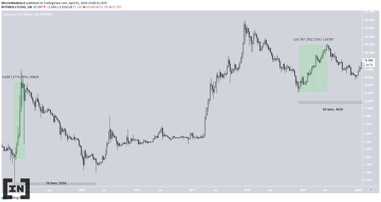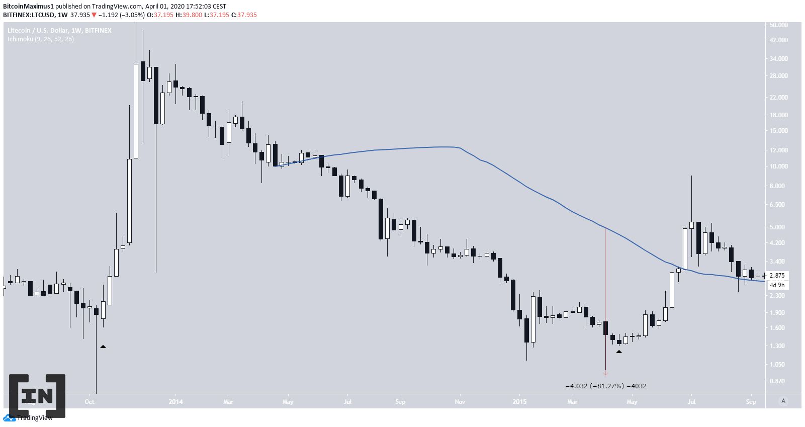 Để bắt đầu, trong biến động năm 2015. Hành động giá LTC đo mức thoái lui bằng 100% so với mức giá thấp di chuyển lên ban đầu. Sau đó, vào ngày tạo đáy thứ hai, giá thấp hơn 81% so với MA 50 tuần.