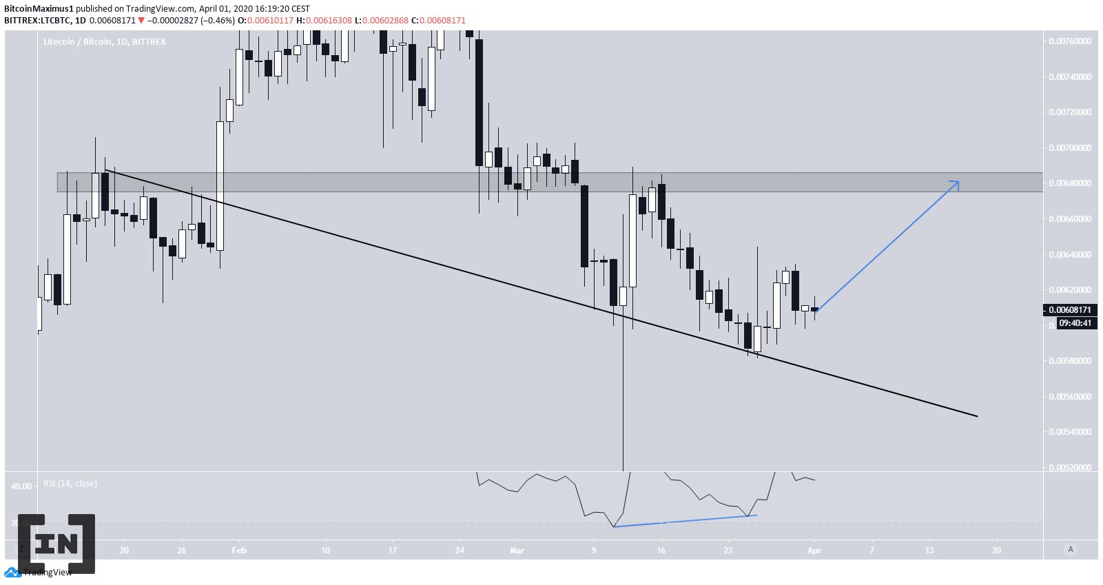 Xem biểu đồ LTC/BTC khung thời gian ngày thể thấy rằng giá LTC đang đi theo đường hỗ trợ giảm dần. Nó đã hoạt động tại đây kể từ ngày 18/01.