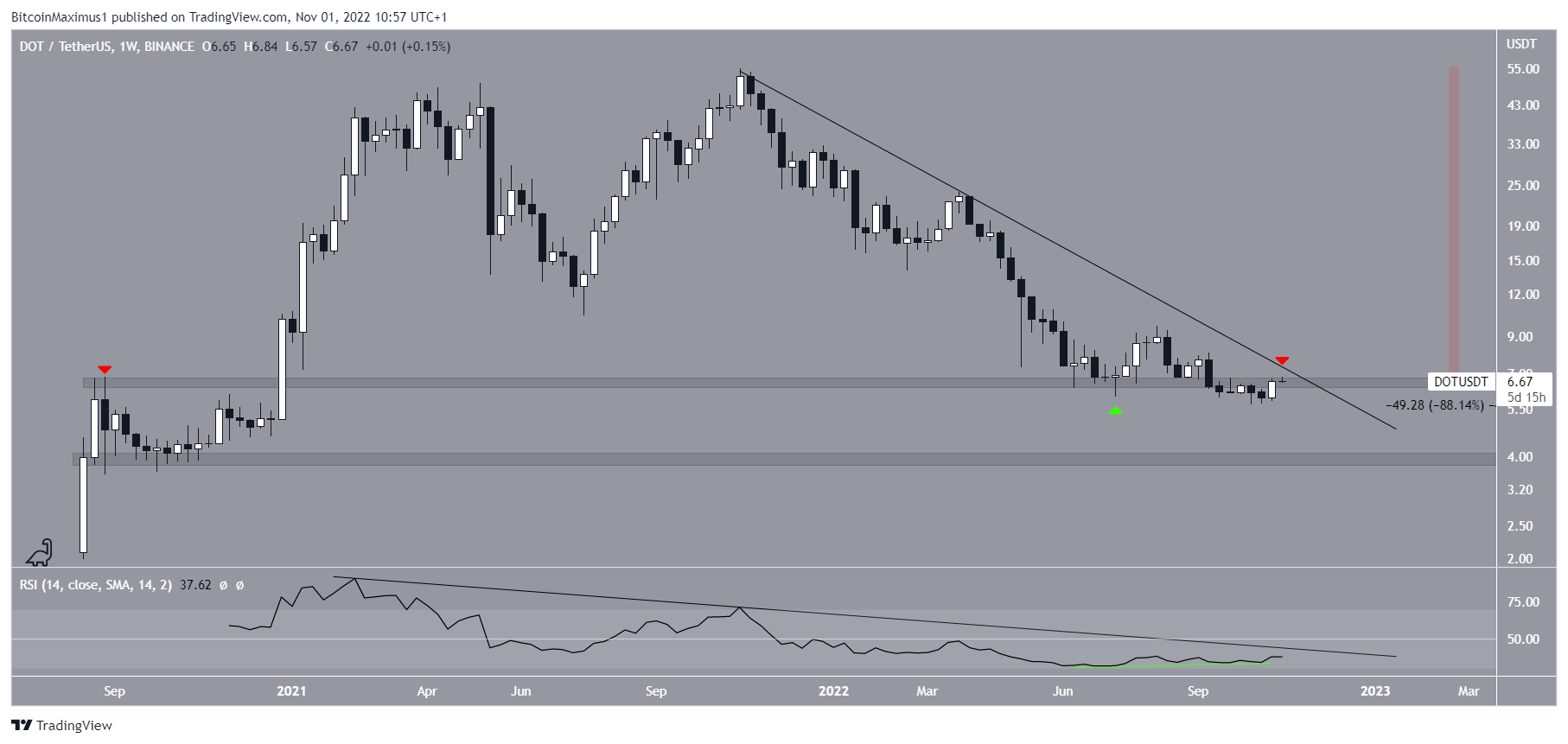 Vào tháng 7/2022, giá Polkadot bật lên tại vùng hỗ trợ ngang 6.65 USD (biểu tượng màu xanh lá cây), tạo ra một râu nến dài dưới trong quá trình này. Tuy nhiên, DOT không thể duy trì xu hướng đi lên này và sự cố đã xảy ra vào tháng 9/2022. Hiện tại, giá đang trong quá trình xác nhận khu vực 6.65 USD là mức kháng cự. Vì khu vực này cũng trùng với đường kháng cự giảm dần nên tầm quan trọng của nó càng tăng lên.