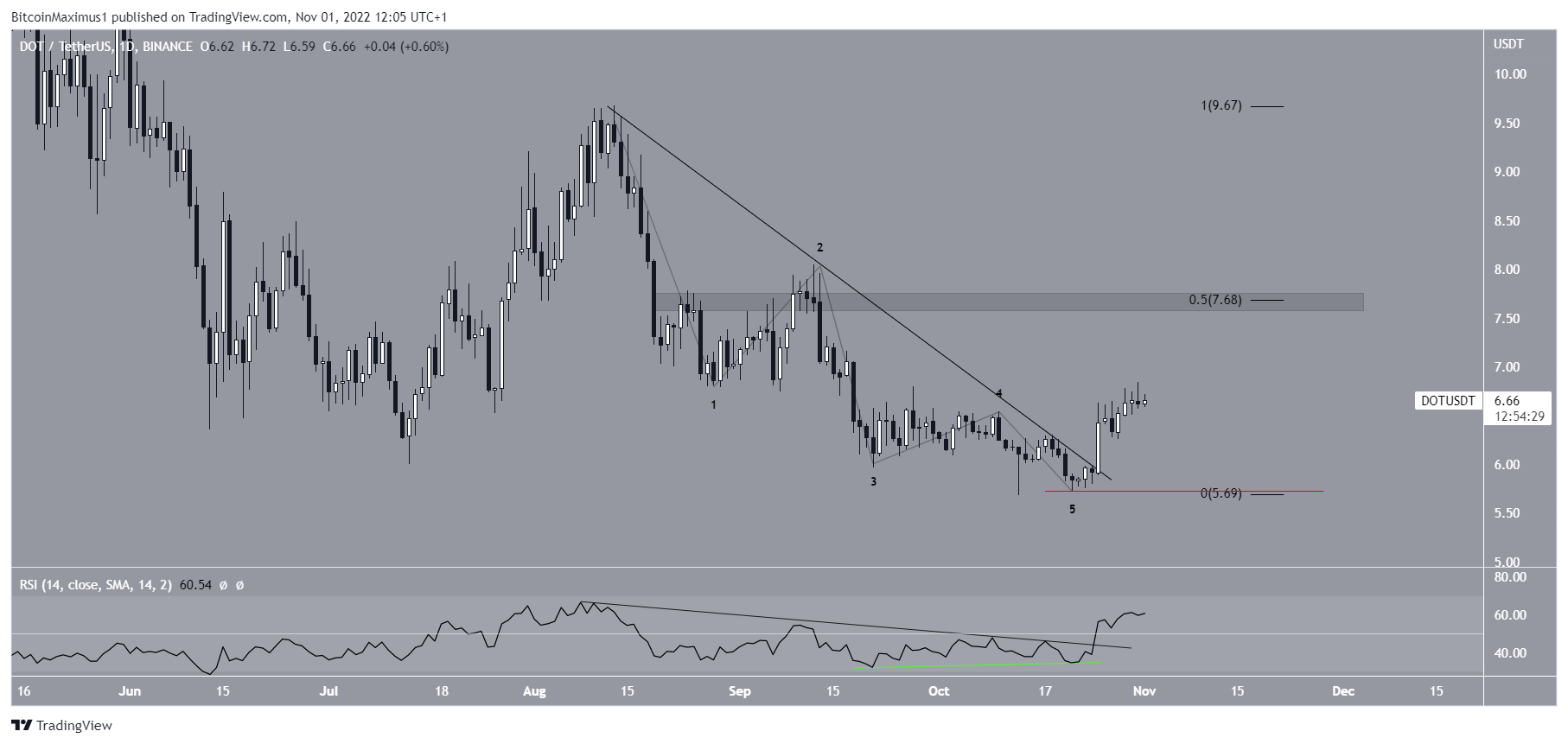 Ngược lại, việc giá giảm xuống dưới mức thấp nhất vào ngày 21/10 là 5.73 USD (đường màu đỏ) sẽ làm mất hiệu lực dự đoán giá Polkadot tăng. Thay vào đó, nó sẽ gợi ý rằng Polkadot sẽ giảm xuống vùng hỗ trợ 3.90 USD.