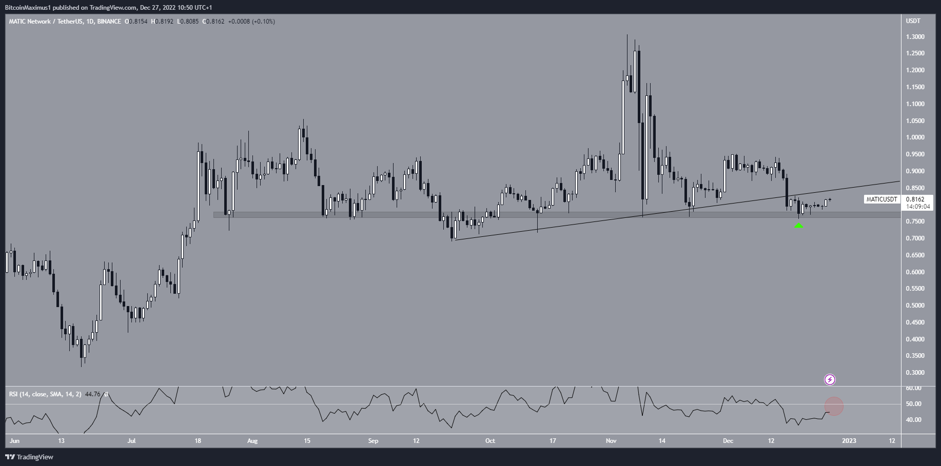Giá MATIC đã tăng dọc theo đường hỗ trợ tăng dần kể từ ngày 21/9. Chuyển động đi lên đã dẫn đến mức cao nhất là 1.3 USD vào ngày 05/11. Tuy nhiên, giá đã giảm ngay sau đó và sau đó phá vỡ đường này vào ngày 16/12, dẫn đến đến mức thấp nhất tại 0.75 USD vào ngày 19/12. Đây là dấu hiệu cho thấy cấu trúc tăng giá của MATIC đã không còn nguyên vẹn nữa. Tuy nhiên, MATIC đã bật lên ở mức hỗ trợ ngang 0.77 USD vào ngày 19/12 (biểu tượng màu xanh lá cây). Chỉ báo RSI cũng đồng thời bật lên và đang tiến sát đường 50 từ bên dưới.