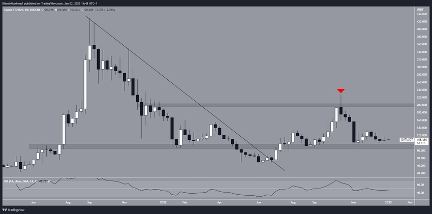 Giá QNT gần như đã quay trở lại vùng hỗ trợ 90 USD. Do đó, nó đang giao dịch trong phạm vi dài hạn từ 90 USD đến 200 USD mà không có hướng chuyển động giá rõ ràng. Hơn nữa, chỉ số RSI hàng tuần rất gần với đường 50, một dấu hiệu của xu hướng trung tính. Do đó, khung thời gian hàng tuần không đủ để đưa ra hướng quyết định cho phân tích dự đoán giá QNT tháng 1/2023.