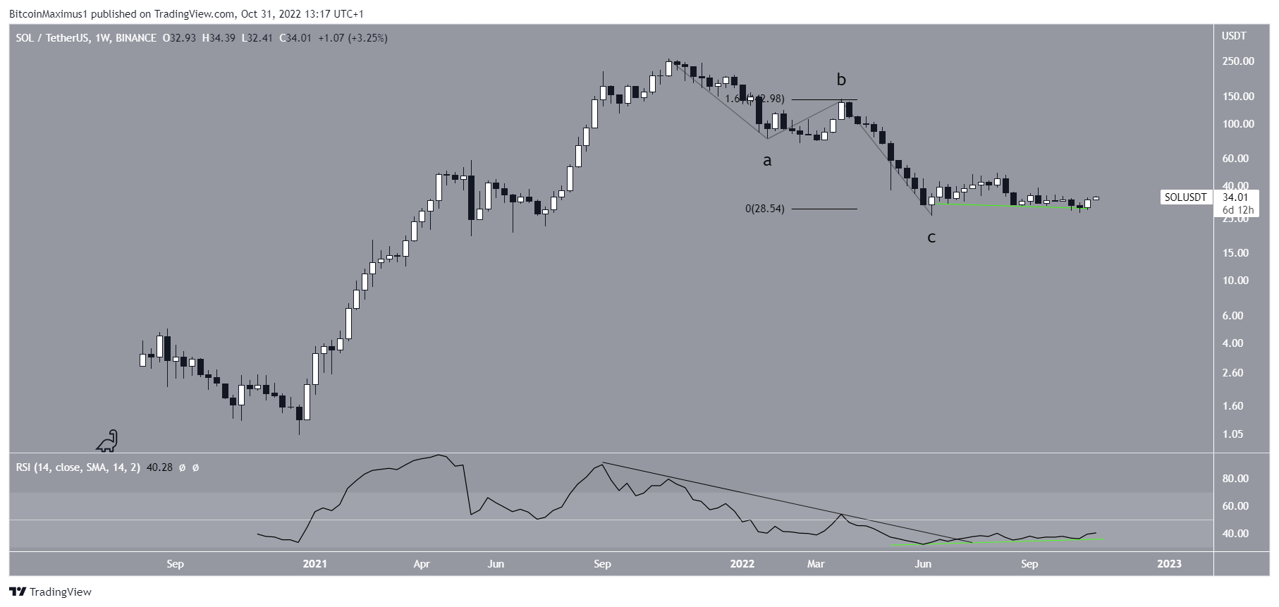 Phân tích kỹ thuật cho khung thời gian tuần cho thấy giá Solana đã giảm kể từ khi đạt mức ATH là 259.90 USD vào tháng 11/2021.