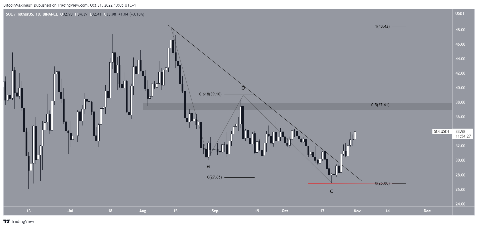 Giá Solana đã giảm dưới đường kháng cự giảm dần kể từ khi đạt mức cao 48.38 USD vào ngày 13/8. Sự sụt giảm dẫn đến mức giá thấp nhất là 26.84 USD vào ngày 21/10. Giá SOL đã đảo ngược xu hướng ngay sau đó và phá kháng cự giảm dần vào ngày 25/10. Đường giá SOL đi xuống trông giống như một đợt điều chỉnh A-B-C đã hoàn thành. Trong đó sóng A:C có tỷ lệ 1:0.618. Đây là kịch bản phổ biến thứ hai trong các cấu trúc như vậy.