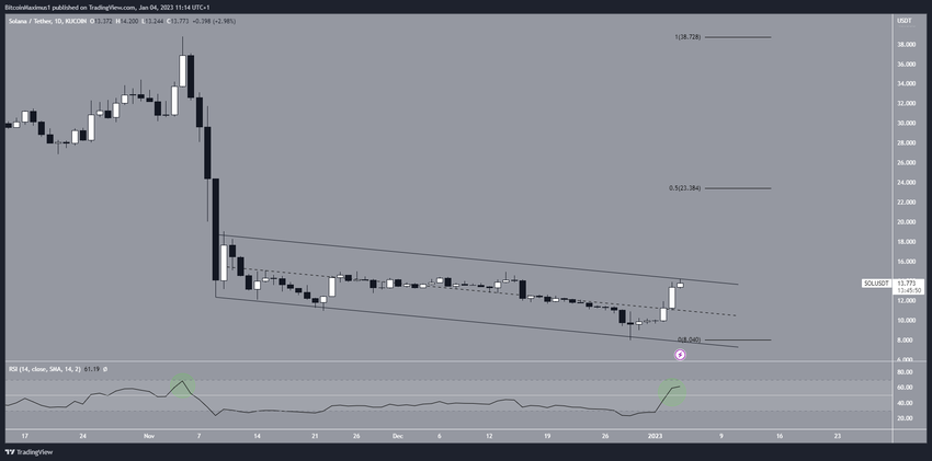 Mặc dù chỉ báo RSI hàng ngày đã vượt qua mức 50, nhưng nó cũng xảy ra điều tương tự vào đầu tháng 11 (vòng tròn màu xanh lá cây) trước khi sụp đổ. Do đó, việc phân tích chỉ báo chưa xác định được xu hướng là tăng giá. Một đột phá khỏi kênh có thể đưa giá SOL tới mức kháng cự Fibo thoái lui 0.5 ở mức 23.4 USD. Ngược lại, việc từ chối có thể gây ra việc kiểm tra lại đường hỗ trợ ở mức 7.8 USD.