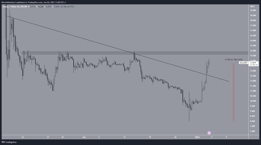 Bất chấp sự sụt giảm, giá SOL đã bắt đầu chuyển động đi lên gần như ngay lập tức sau mức thấp nhất, tạo ra một bấc dài phía dưới trong quá trình này (biểu tượng màu xanh lá cây). Nó đã thoát ra khỏi đường kháng cự giảm dần vào ngày 04/1 và đã tăng 72% cho đến nay. Sau khi đột phá, Solana đạt mức giá cao ngắn hạn tại 14.2 USD. Giá mã thông báo SOL hiện đang tiến gần đến vùng kháng cự 14.8 USD.