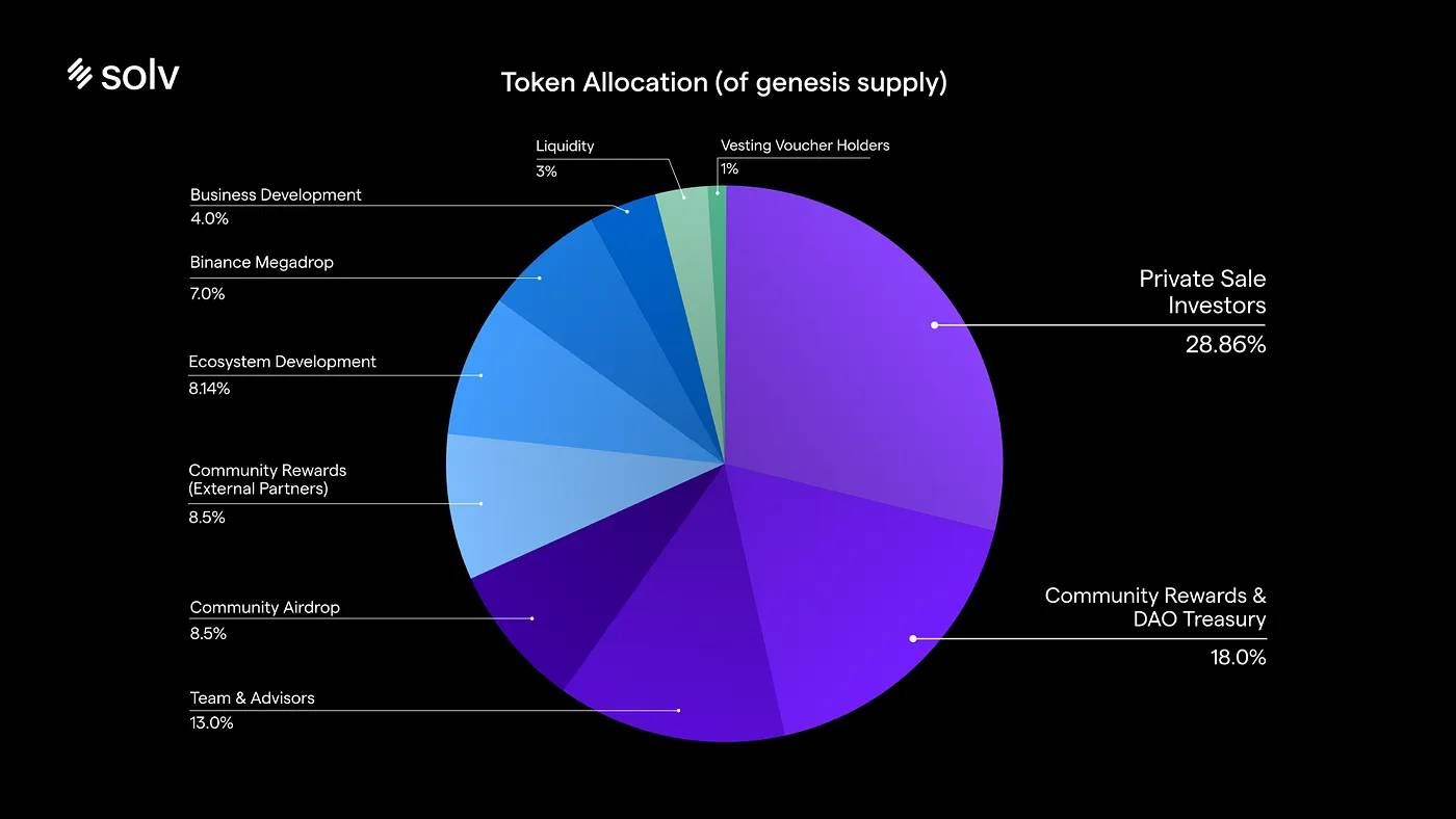 - Tổng cung tối đa của SOLV là 9.66 tỷ token, và tổng cung tại thời điểm TGE 8.44 tỷ. Trong đó, 7% của nguồn cung ban đầu (genesis supply) sẽ được phân phối qua Binance Megadrop. Đây là pool phân phối duy nhất được mở khóa 100% ngay sau TGE, có thể tạo ra một áp lực bán nhất định từ những người nhận token này nếu họ quyết định bán ngay lập tức để chốt lời.