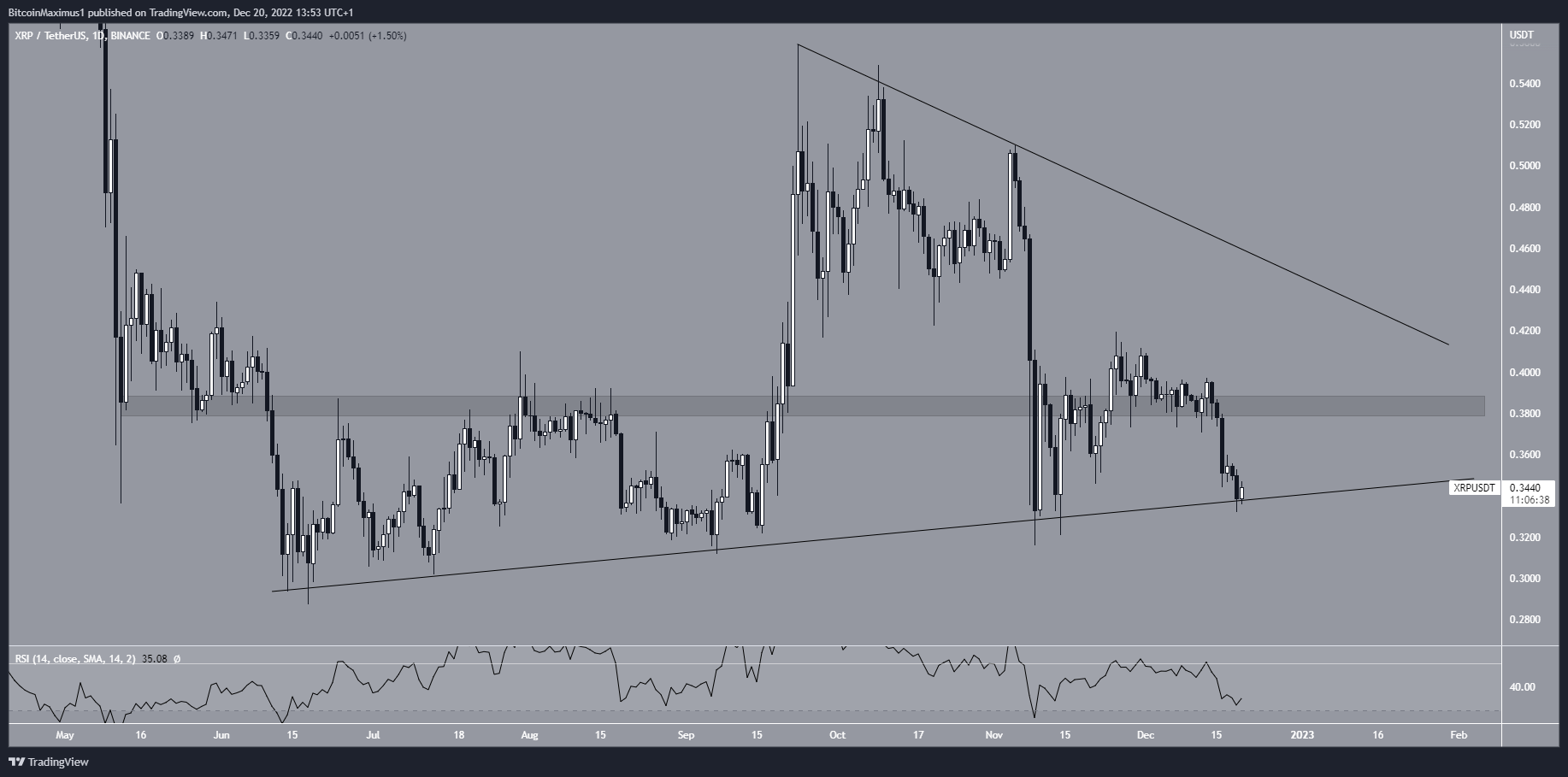XRP là token gốc của Ripple Labs, được tạo bởi Jed McCaleb. Nó chủ yếu được sử dụng như một mạng thanh toán toàn cầu. Giá XRP đã tăng cùng với đường hỗ trợ tăng dần kể từ đầu tháng Sáu. Đường này đã được xác thực nhiều lần, gần đây nhất là vào ngày 19/12 (biểu tượng màu xanh lá cây). Tuy nhiên, giá XRP vẫn thể chưa bật tăng từ đường này sau khi xác thực nó.