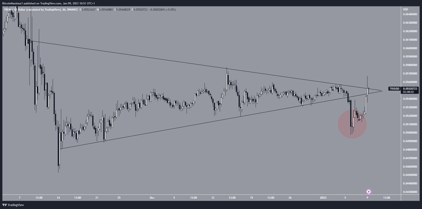 Phân tích kỹ thuật từ khung thời gian 6 giờ đang nghiêng về một đột phá thành công. Lý do chính cho điều này là vào ngày 05/1, giá TRX dường như bị phá vỡ khỏi một tam giác đối xứng (vòng tròn màu đỏ). Tuy nhiên, nó đã lấy lại đường hỗ trợ của tam giác trong 24 giờ tới và hiện đang cố gắng bứt phá.