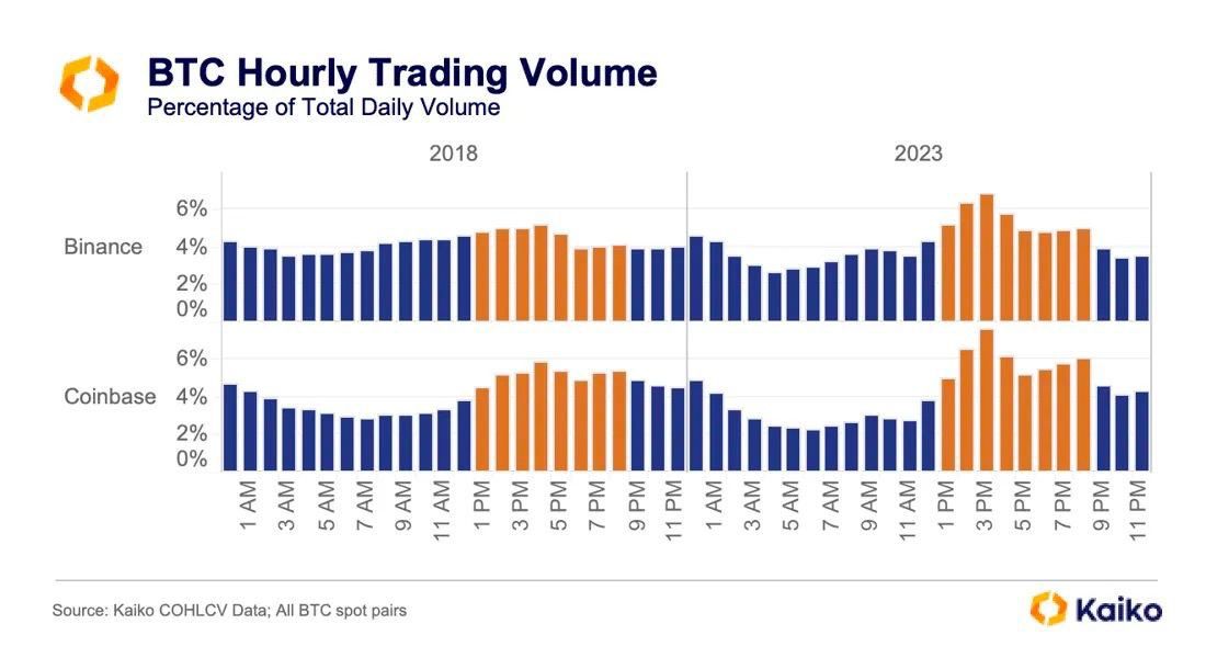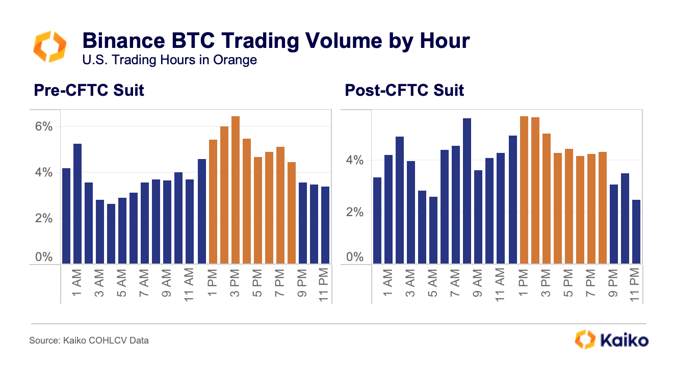 Dữ liệu thống kê từ Kaiko về khối lượng giao dịch theo từng khung giờ của sàn Binance và Coinbase khiến cho cáo buộc của CFTC thêm phần thuyết phục.