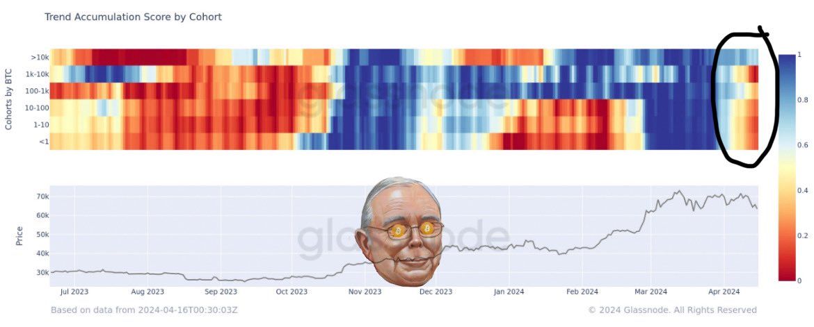 Dữ liệu Bitcoin Trend Accumulation Score by Cohort từ glassnode được @bitcoinmunger chia sẻ, cho thấy điểm xu hướng tích lũy trên hầu hết các hạng ví từ dưới 10,000 BTC đã xoay chiều trong giữa tháng 4. Tất cả các hạng ví từ dưới 10,000 BTC đều có thể đã ngưng tích lũy hoặc phân phối BTC. Riêng hạng ví cá voi trên 10,000 BTC vẫn giữ mức điểm tích lũy trên 0.5 nhưng đã giảm so với cuối tháng 3 (màu xanh đậm đã thành xanh nhạt).