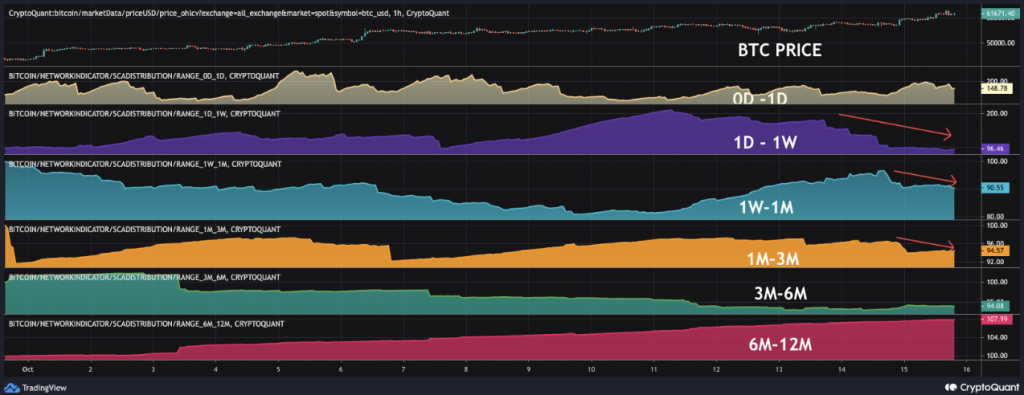 - Một chỉ số on-chain khác nữa là lượng lưu trữ đến từ các nhóm NĐT khác nhau. Theo thống kê, tỷ lệ nắm giữ BTC trong khoảng thời gian từ 1 ngày đến dưới 3 tháng có dấu hiệu giảm dần. Ngược lại, những NĐT nắm giữ BTC trên 6 tháng có dấu hiệu tăng rõ rệt.