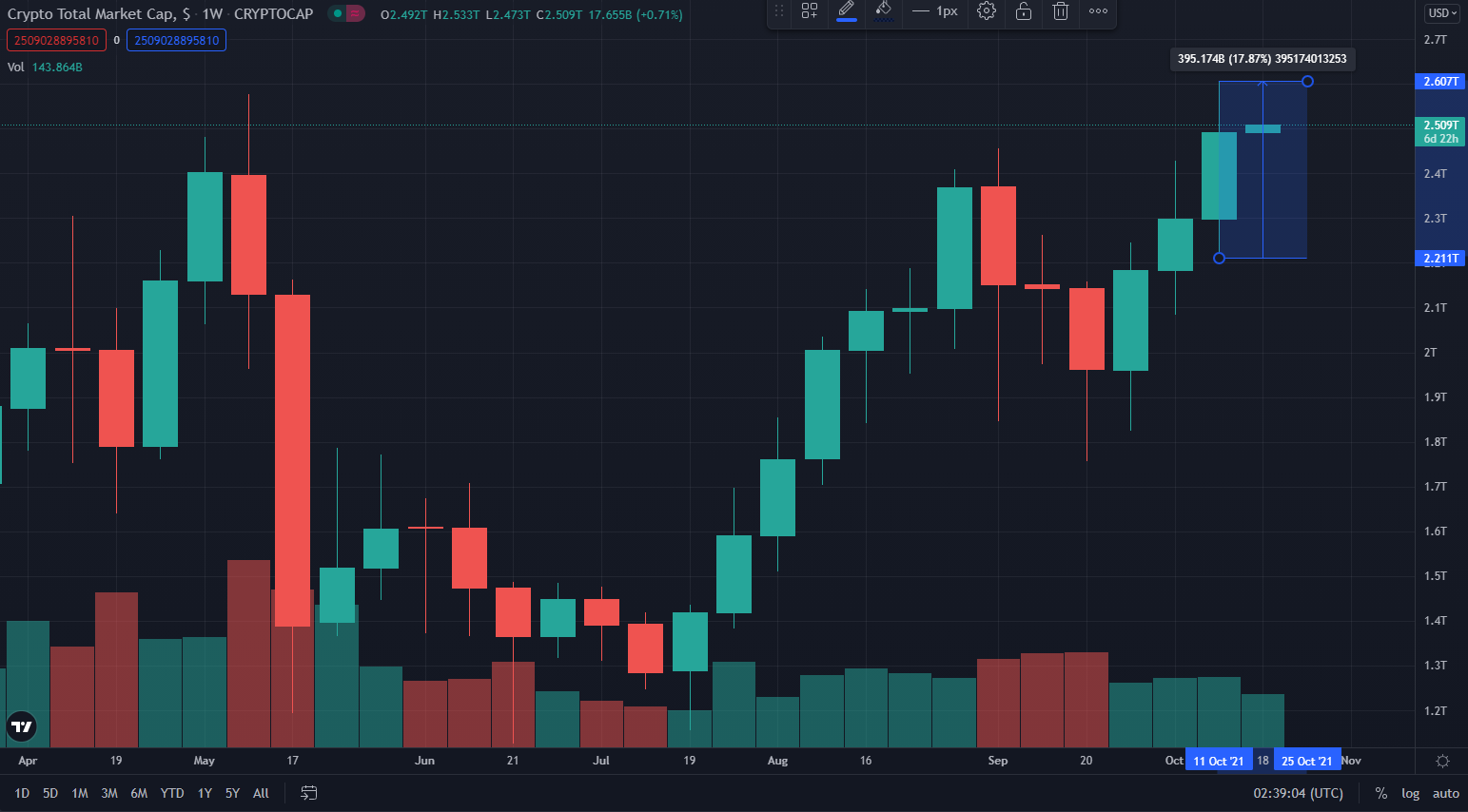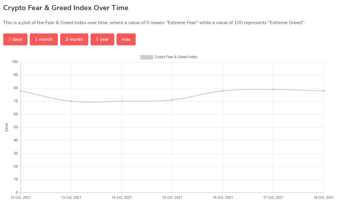 Tuần qua, chỉ số Crypto Fear & Greed Index dao động từ mức 70 – 78 (Greed – Extreme Greed). NĐT có xu hướng tham lam khi thị trường tăng, dẫn đến tâm lý FOMO (sợ bỏ lỡ). Bằng chứng là vốn hóa của toàn thị trường tăng vọt. Bản thân giá cả của các đồng coin lớn như BTC hay Ethereum (ETH) đang rất gần với mức đỉnh được thiết lập hồi tháng 4/2021.