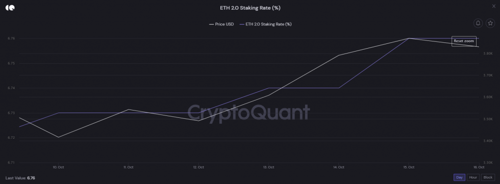 - Tỷ lệ staking trên hợp đồng Ethereum 2.0 tăng nhẹ tuần qua. Mức tăng từ 6.73% (11/10) lên 6.76% (16/10).