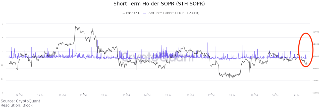 Hình trên cho chúng ta thấy, chỉ tính riêng trong ngày 31/10, lượng BTC bán ra bởi các Short term holder có dấu hiệu vượt trội hơn hẳn. Như trong bản tin on-chain của tuần trước mà BeInCrypto đã có dịp chia sẻ, tỷ lệ những người nắm giữ BTC đang có lời hiện ở mức cao. Việc bán ra được xem như là một hành động tất yếu để thị trường nguội lại, lấy đà tăng cho đợt tăng trường tiếp theo.
