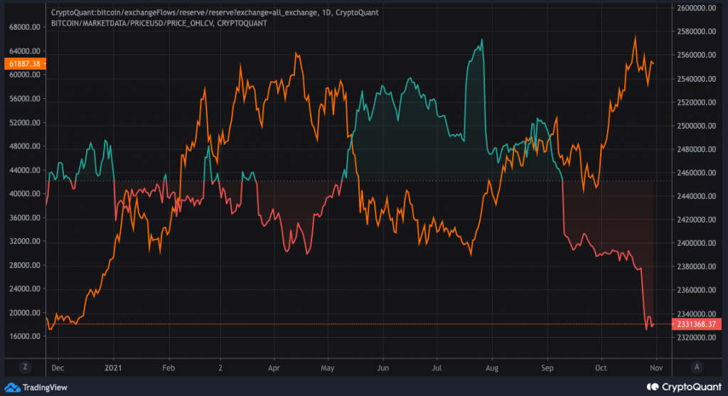 Sau một thời gian thì dường như dòng tiền vào/ra đến từ các sàn giao dịch đã có dấu hiệu giảm nhiệt tuần này. Lượng dự trữ BTC trên các sàn hầu như không thay đổi quá nhiều. Tuy nhiên, nếu xét trong một phạm vi xa hơn của lịch sử, chúng ta sẽ thấy một xu hướng chung của thị trường.