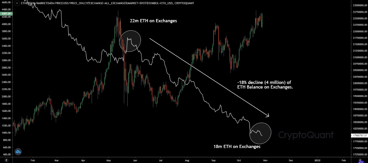 Chỉ trong thời gian 5 tháng cho đến nay, nguồn cung Ethereum có sẵn trên các sàn giao dịch lớn đã giảm lên đến 18%. Con số này tương đương với khoảng 4 triệu ETH đã rời khỏi các sàn giao dịch.
