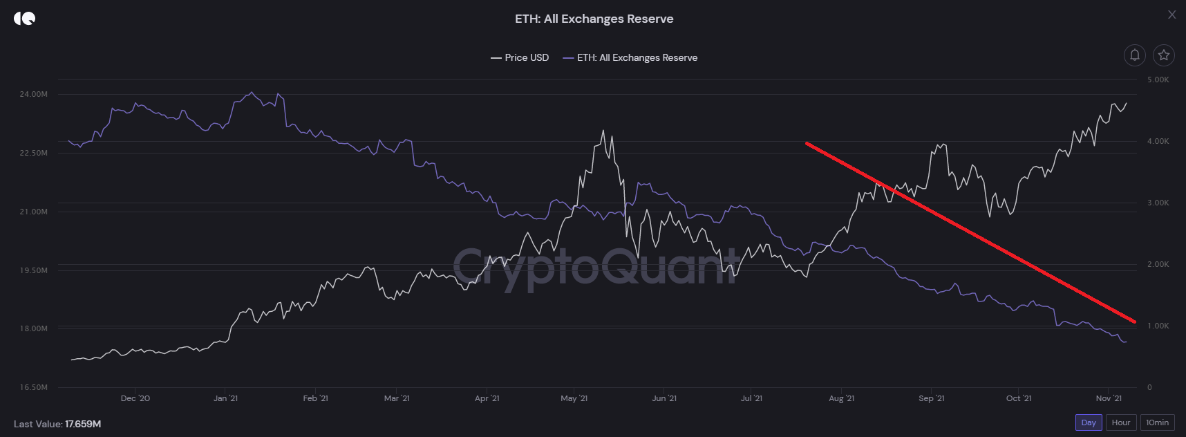Không nằm ngoài dự đoán, lượng ETH trên các sàn giao dịch vẫn tiếp tục có dấu hiệu sụt giảm đáng kể. Đầu tuần, chúng ta có 17,890,940 ETH trên các sàn giao dịch. Tuy nhiên, kết tuần con số này chỉ còn lại 17,659,710 ETH. Như vậy, có khoảng 231,000 ETH đã rời khỏi sàn trong thời kỳ này.