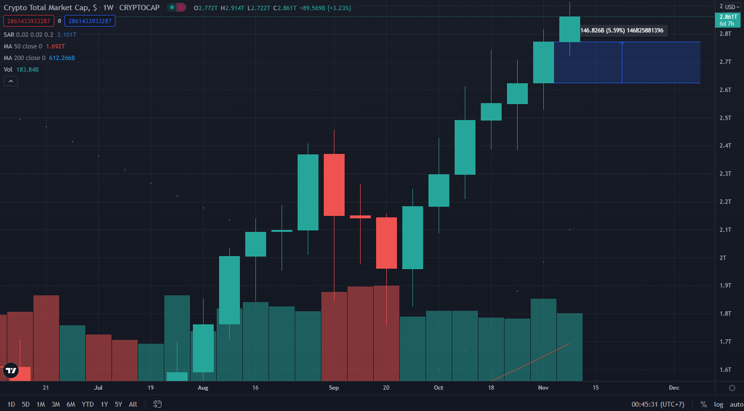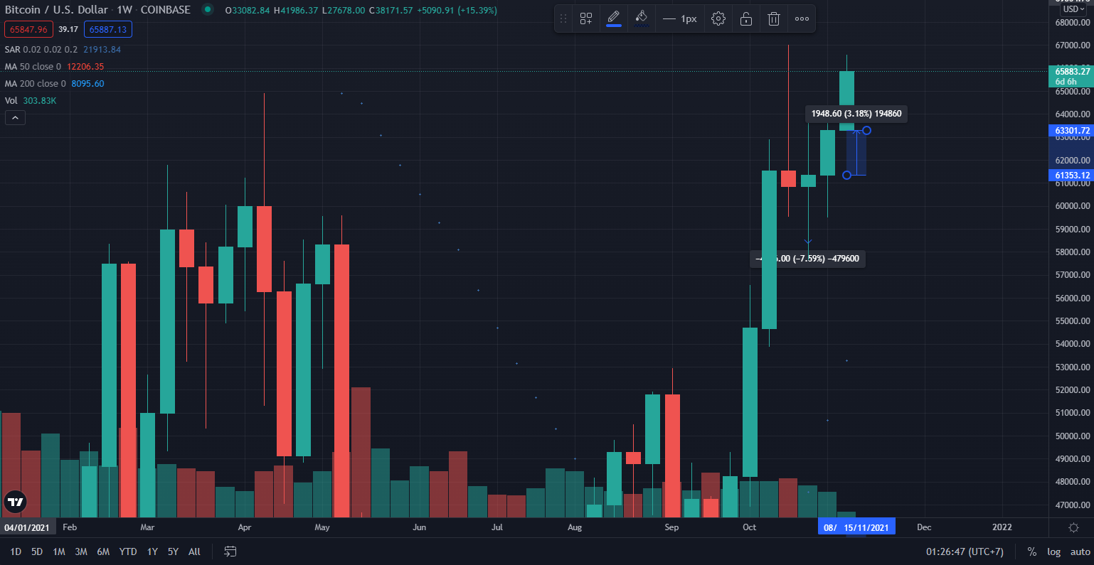 Đây là tuần thứ 3 liên tiếp giá BTC có xu hướng đóng nến tuần với một ngọn nến xanh. Các nhà đầu tư đang ở giai đoạn cực kỳ hưng phấn. Điều này có nghĩa là tâm lý chốt lời có thể xảy ra bất cứ khi nào. Tuy nhiên, tuần tới đây có lẽ sẽ là một tuần đầy đặc biệt với Bitcoin. Bản cập nhật Bitcoin Taproot sẽ chính thức diễn ra. Liệu rằng tác nhân này có thể thúc đẩy Bitcoin đạt mức đỉnh mới và đạt mức 98,000 USD vào cuối năm theo như dự báo của PlanB hay không? Chúng ta hãy cùng chờ xem diễn biến của thị trường trong tuần tới. Đừng quên tham gia nhóm Telegram của BeInCrypto để cập nhật những bài phân tích on-chain hàng tuần nhé.