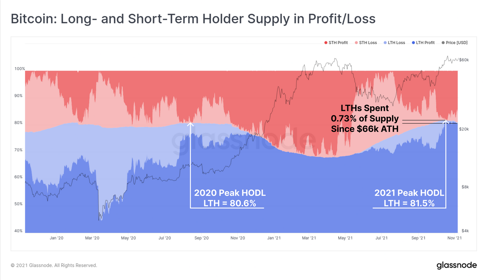 Khi Bitcoin tăng lên mức ATH, gần đây là 66 nghìn USD, nguồn cung do LTH nắm giữ cũng đạt đến đỉnh. Theo thống kê từ glassnode, đây là thời điểm nguồn cung mà các LTH đang nắm giữ chạm tới mức 81.5%. Mức đỉnh của năm 2020 chỉ dừng lại ở mức 80.6%. Một vài chỉ số on-chain cho thấy, khi BTC đạt mức 66,000 USD, tỷ lệ nắm giữ của các LTH đã giảm 0.73%. Đây có thể được xem như là dấu hiệu chốt lời trong giai đoạn này.