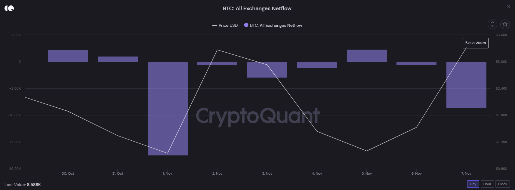Xét theo chỉ số BTC: All Exchanges Netflow, tuần vừa qua chúng ta vẫn chứng kiến tình trạng BTC tiếp tục được rời khỏi các sàn giao dịch. Theo thống kê, chỉ tính riêng ngày 1/11 và 7/11 đã có khoảng hơn 26,000 BTC rời đi.