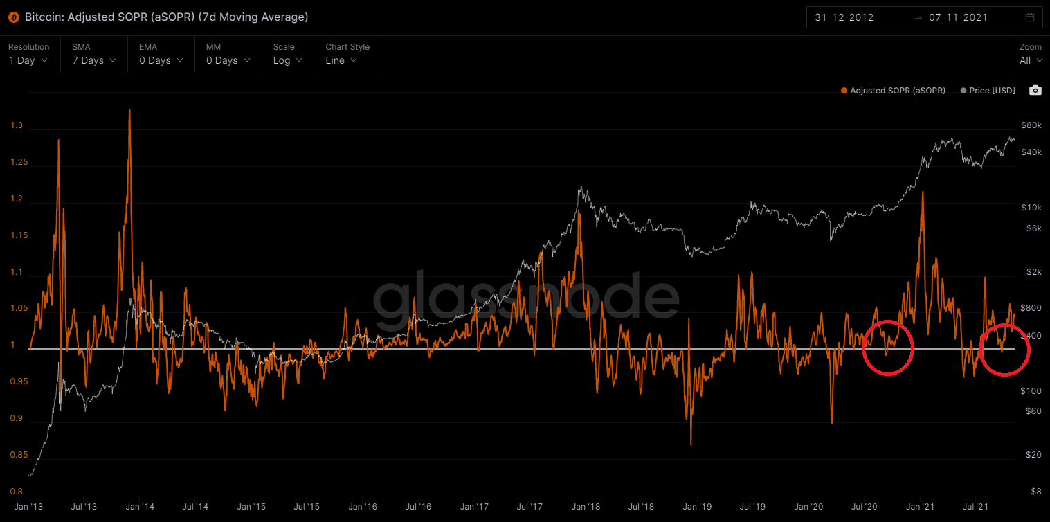 Tại thời điểm tháng 9/2020, chúng ta cũng chứng kiến những tín hiệu tương tự như hiện tại. Chỉ số đi nhẹ xuống vùng dưới 1 trước khi bật tăng nhanh chóng sau đó. Nếu lịch sự lặp lại trong trường hợp này, rất có thể chúng ta sẽ chứng kiến một sự bùng nổ về giá Bitcoin vào cuối năm 2021, đầu năm 2022.