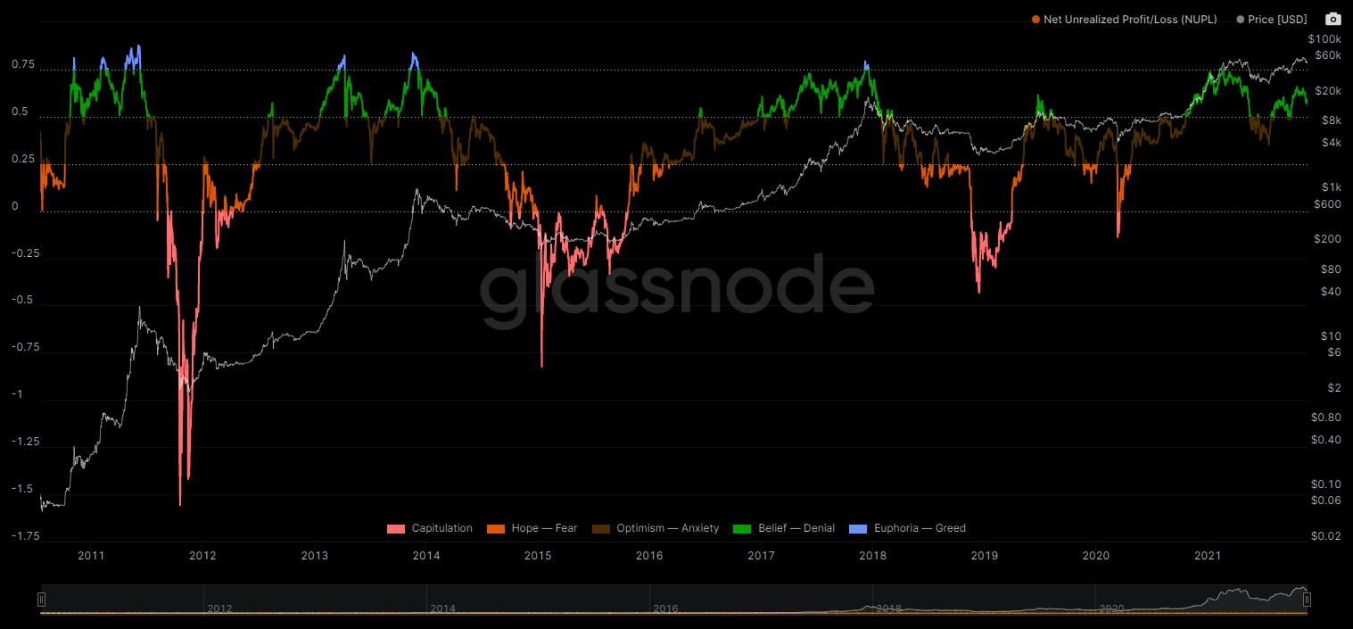 Vào cuối tháng 5/2021, NUPL đã giảm xuống dưới mức 0.5. Theo lịch sử trước đó, mức giảm xuống dưới 0.5 có thể đánh dấu sự kết thúc của thị trường tăng giá. Tuy nhiên, chỉ báo này đã tăng lên kể từ đó và hiện đang ở mức 0.62. Do đó, xu hướng tăng vẫn còn nguyên vẹn.