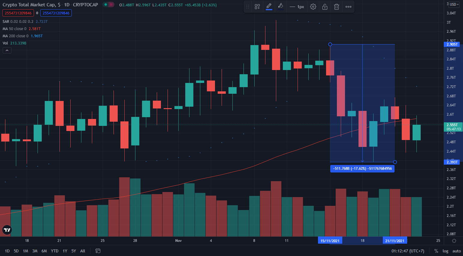 Tuần vừa qua có lẽ lại là một tuần đỏ lửa nữa đối với toàn thị trường tiền điện tử. Tổng vốn hóa dao động từ mức cao nhất 2.905 nghìn tỷ USD xuống mức thấp nhất chỉ còn 2.393 nghìn tỷ USD, tương đương giảm 17.62% (xem hình dưới đây).