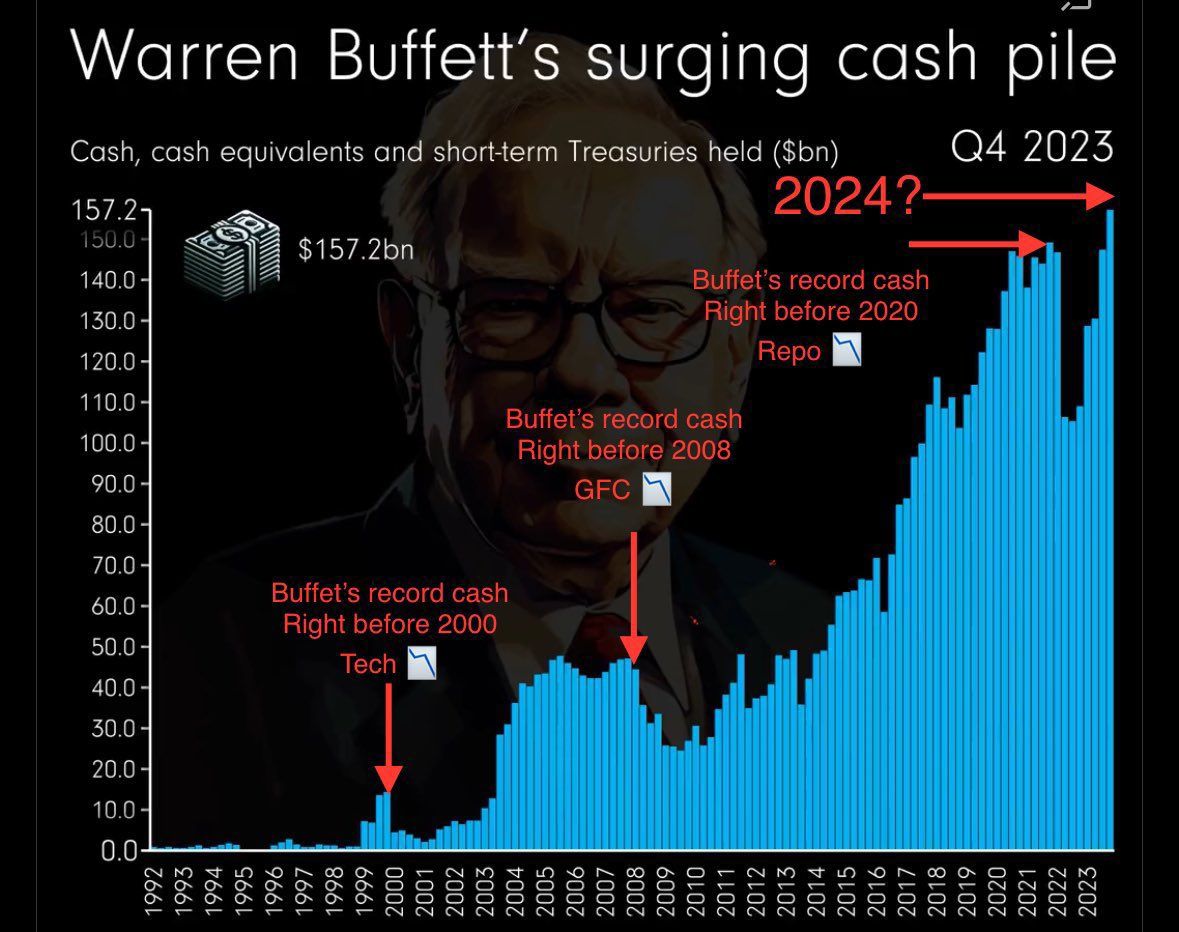 Berkshire Hathaway của Warren Buffett đã công bố những số liệu mới nhất về lượng dự trữ tiền mặt của công ty trong Q1/2024. Và những số liệu mới này khiến dấy lên nhiều tranh luận, nhiều nhà đầu tư cho rằng nó phản ánh tầm nhìn của Warren Buffett trong tương lai.