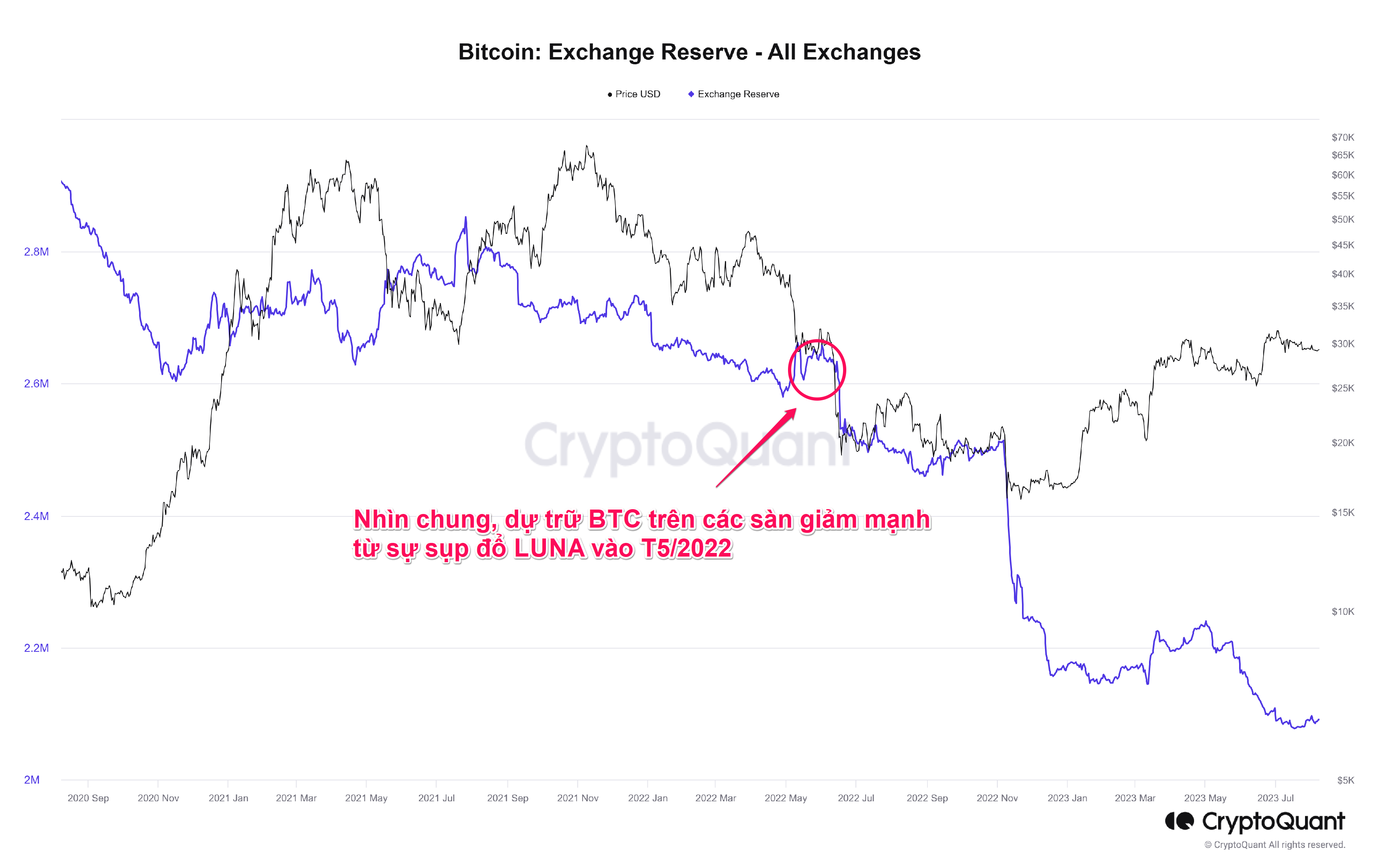 Để có thể so sánh khách quan, hãy bắt đầu bằng việc đánh dấu thời điểm xu hướng giảm mạnh của lượng BTC được dự trữ trên các sàn. Đó là lúc LUNA sụp đổ hồi tháng 5/2022.
